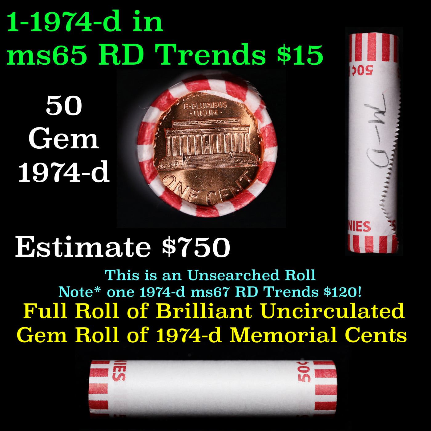 Shotgun Lincoln 1c roll, 1974-d 50 pcs Bank Wrapper.. A terrific Shotgun roll of Lincoln cents. Most if not all coin should be cherry red.