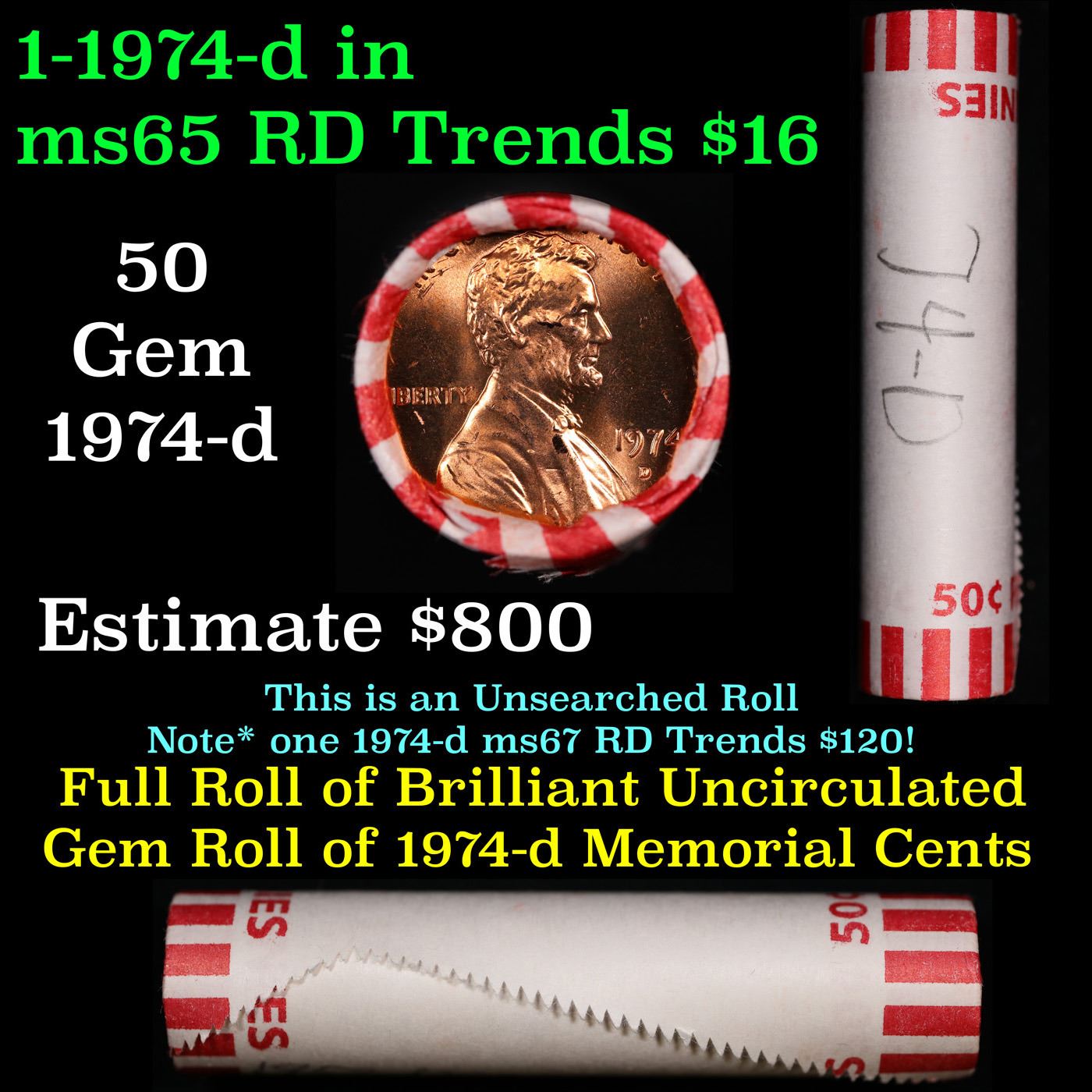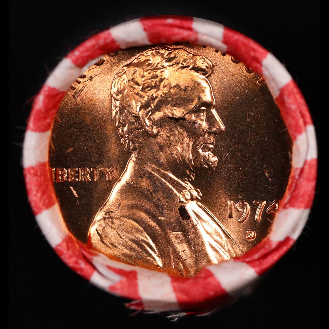 Shotgun Lincoln 1c roll, 1974-d 50 pcs Bank Wrapper.. A terrific Shotgun roll of Lincoln cents. Most if not all coin should be cherry red.