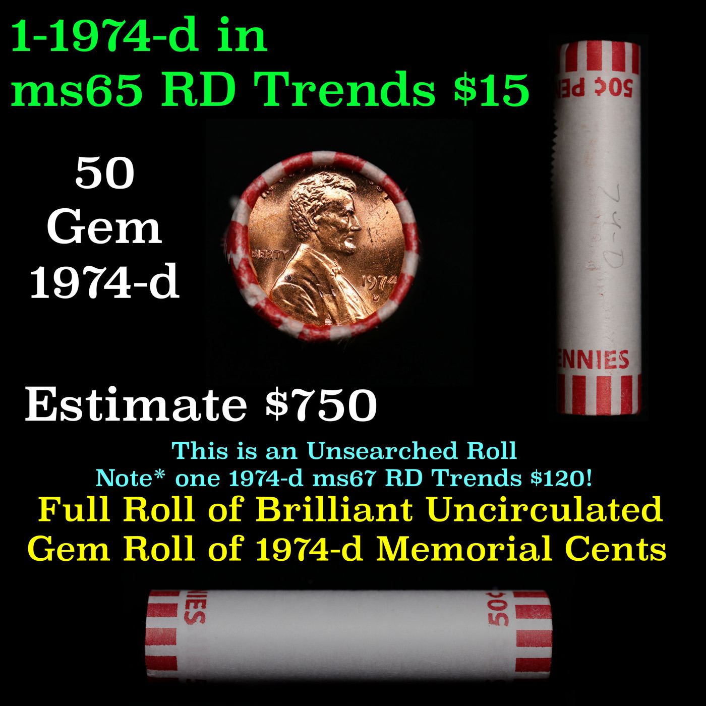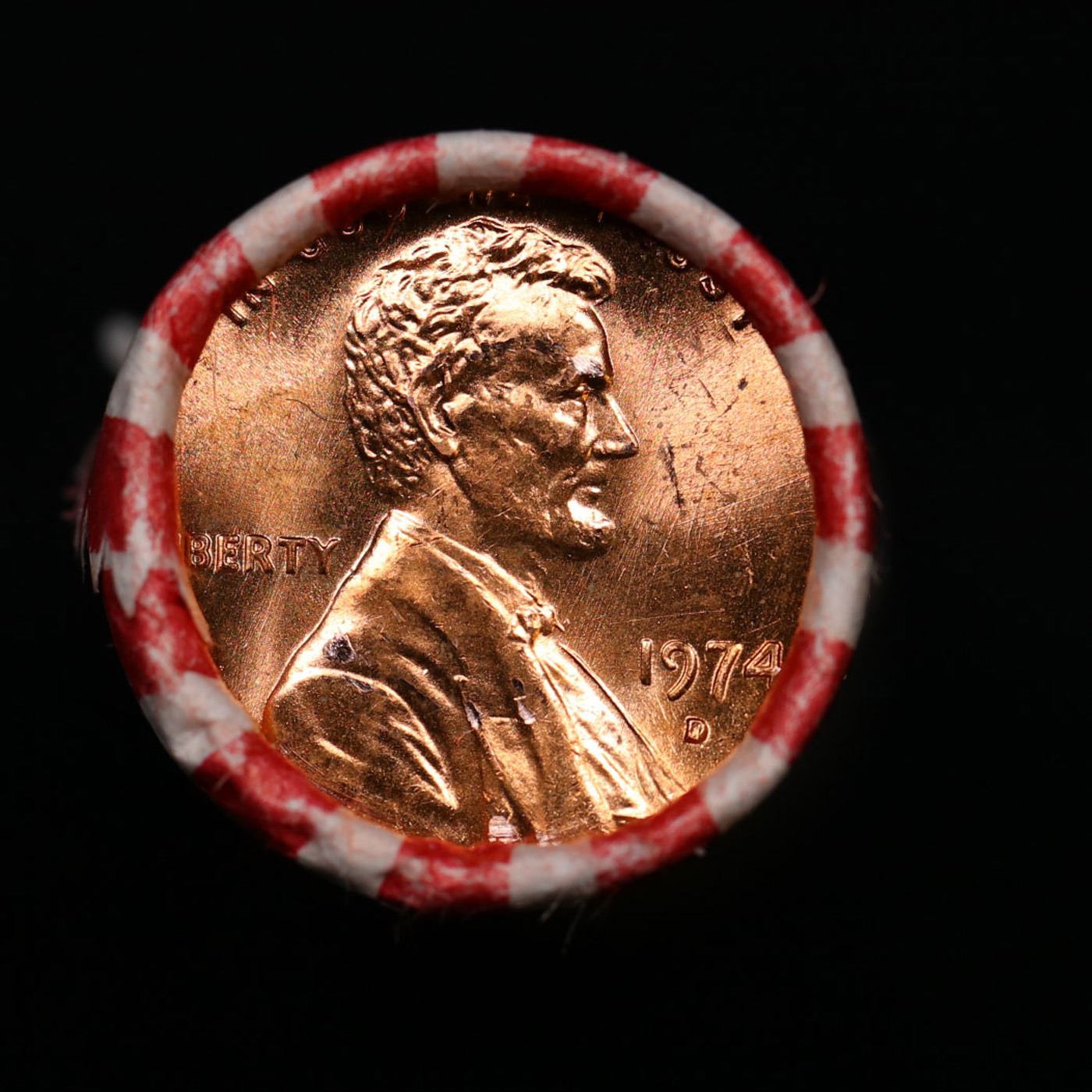 Shotgun Lincoln 1c roll, 1974-d 50 pcs Bank Wrapper.. A terrific Shotgun roll of Lincoln cents. Most if not all coin should be cherry red.