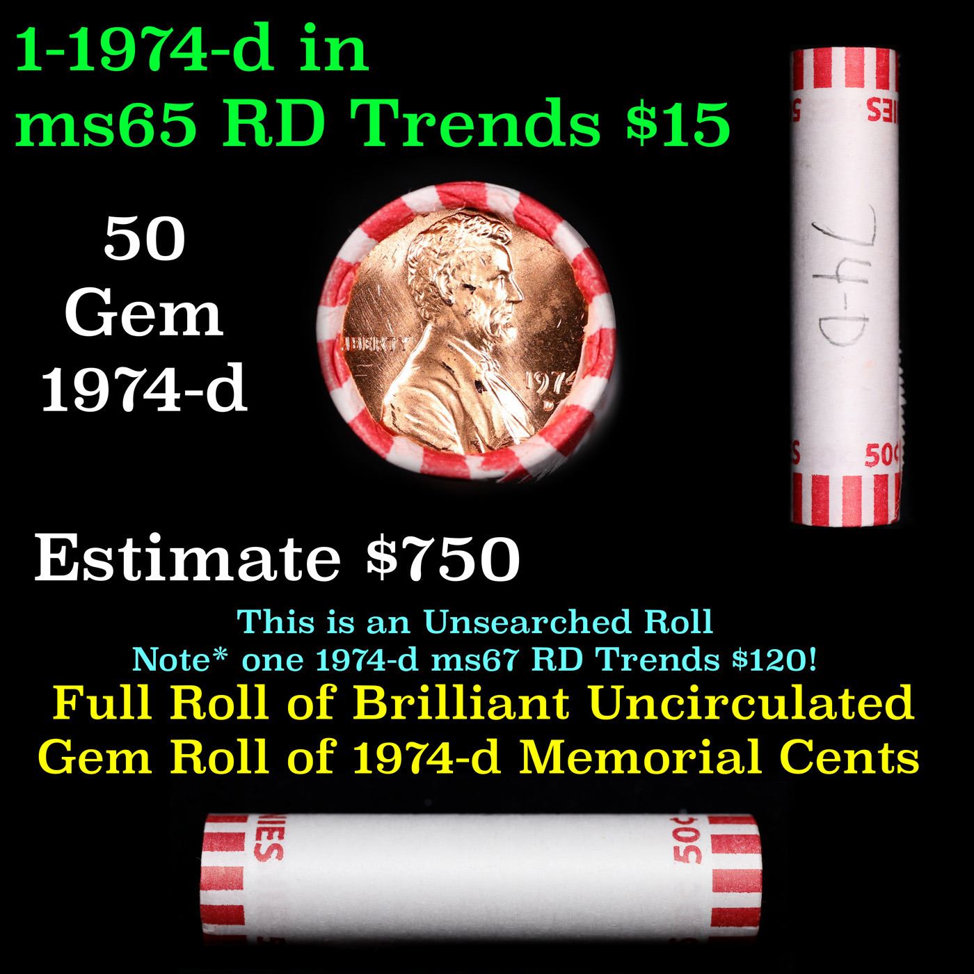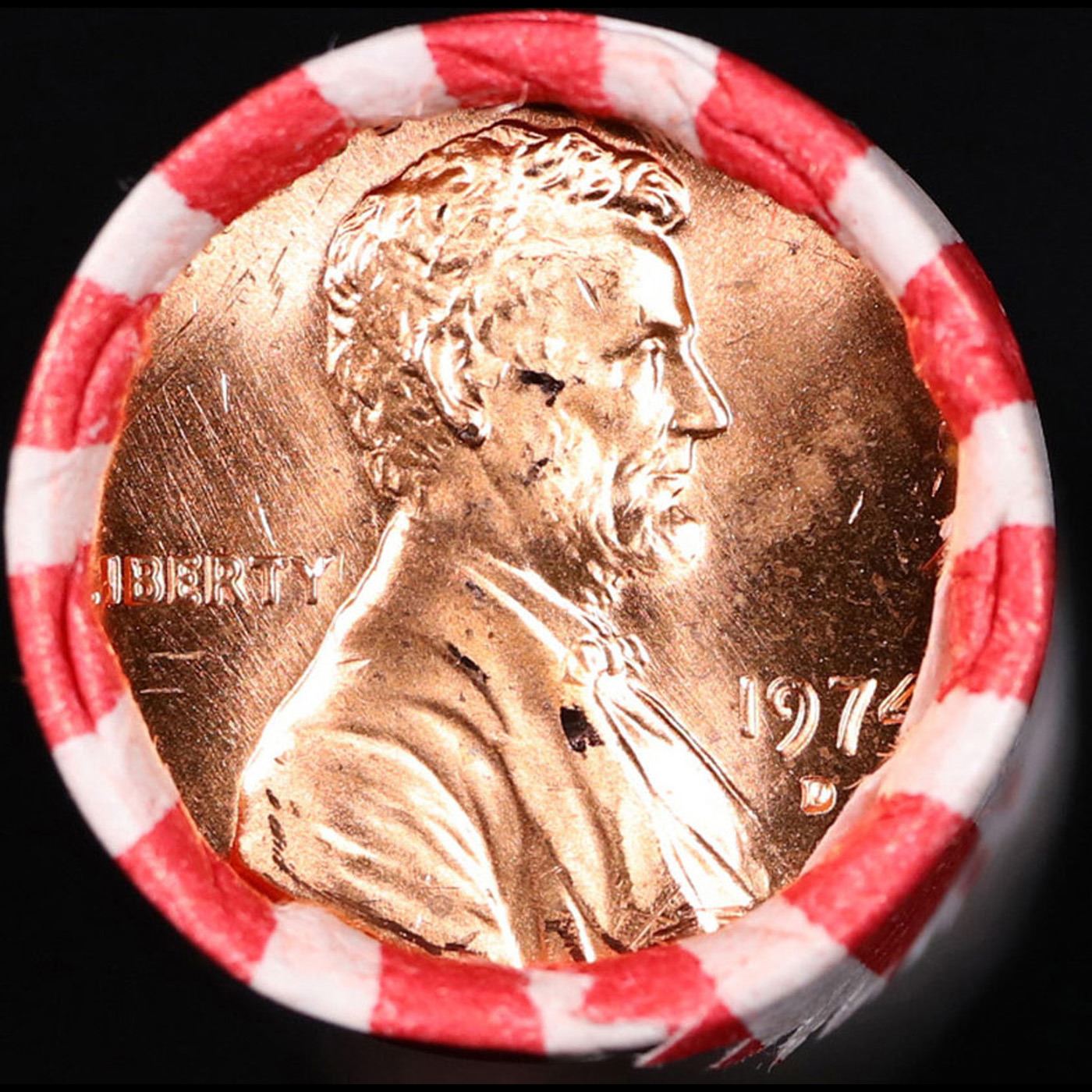 Shotgun Lincoln 1c roll, 1974-d 50 pcs Bank Wrapper.. A terrific Shotgun roll of Lincoln cents. Most if not all coin should be cherry red.