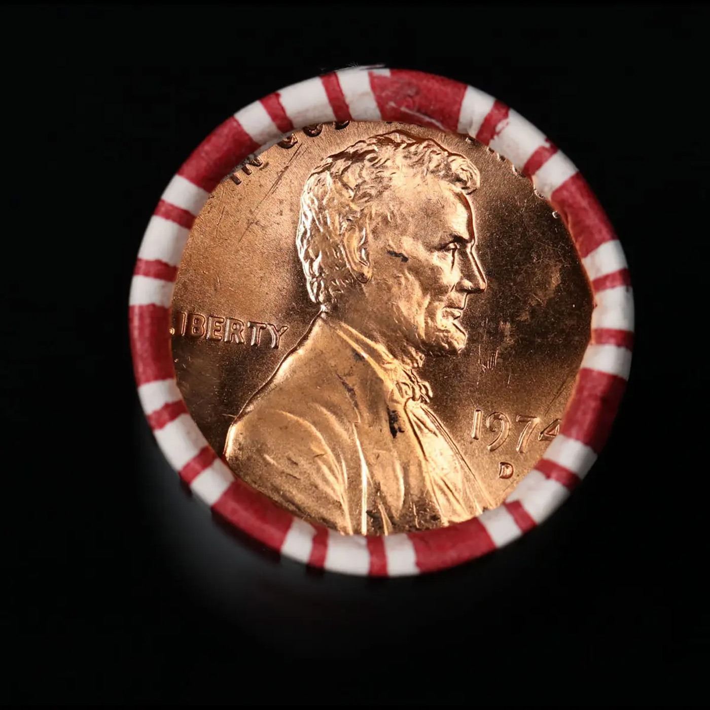 Shotgun Lincoln 1c roll, 1974-d 50 pcs Bank Wrapper.. A terrific Shotgun roll of Lincoln cents. Most if not all coin should be cherry red.