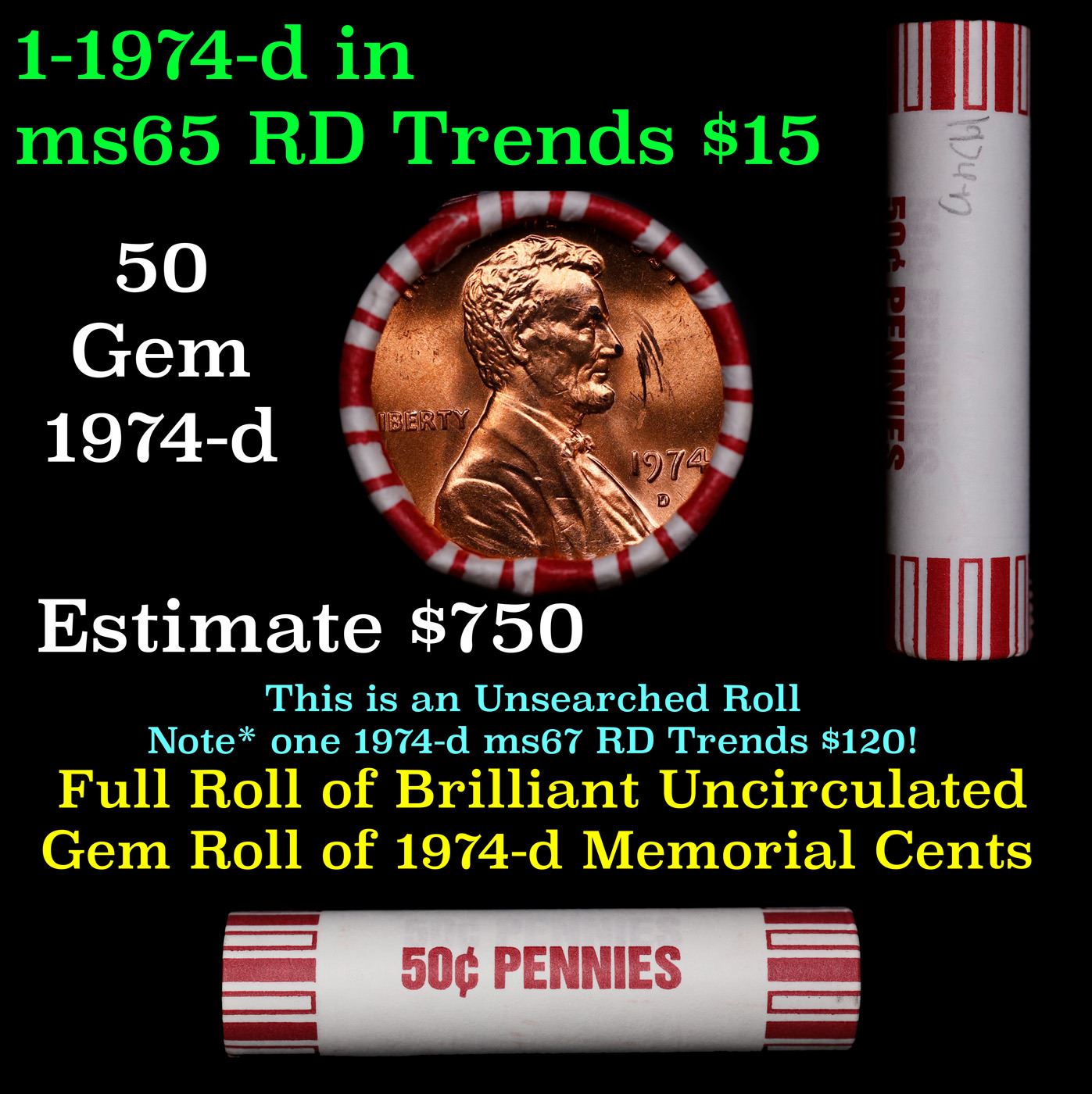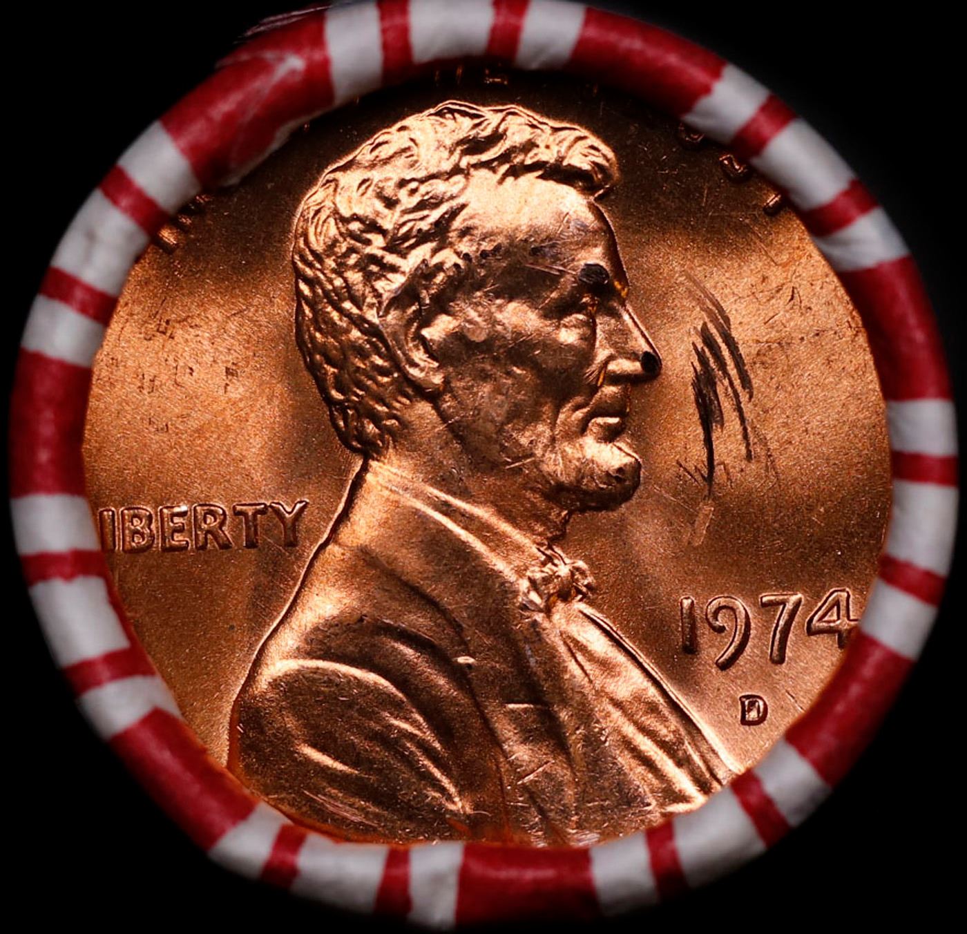 Shotgun Lincoln 1c roll, 1974-d 50 pcs Brandt 50c Wrapper.. A terrific Shotgun roll of Lincoln cents. Most if not all coin should be cherry red.