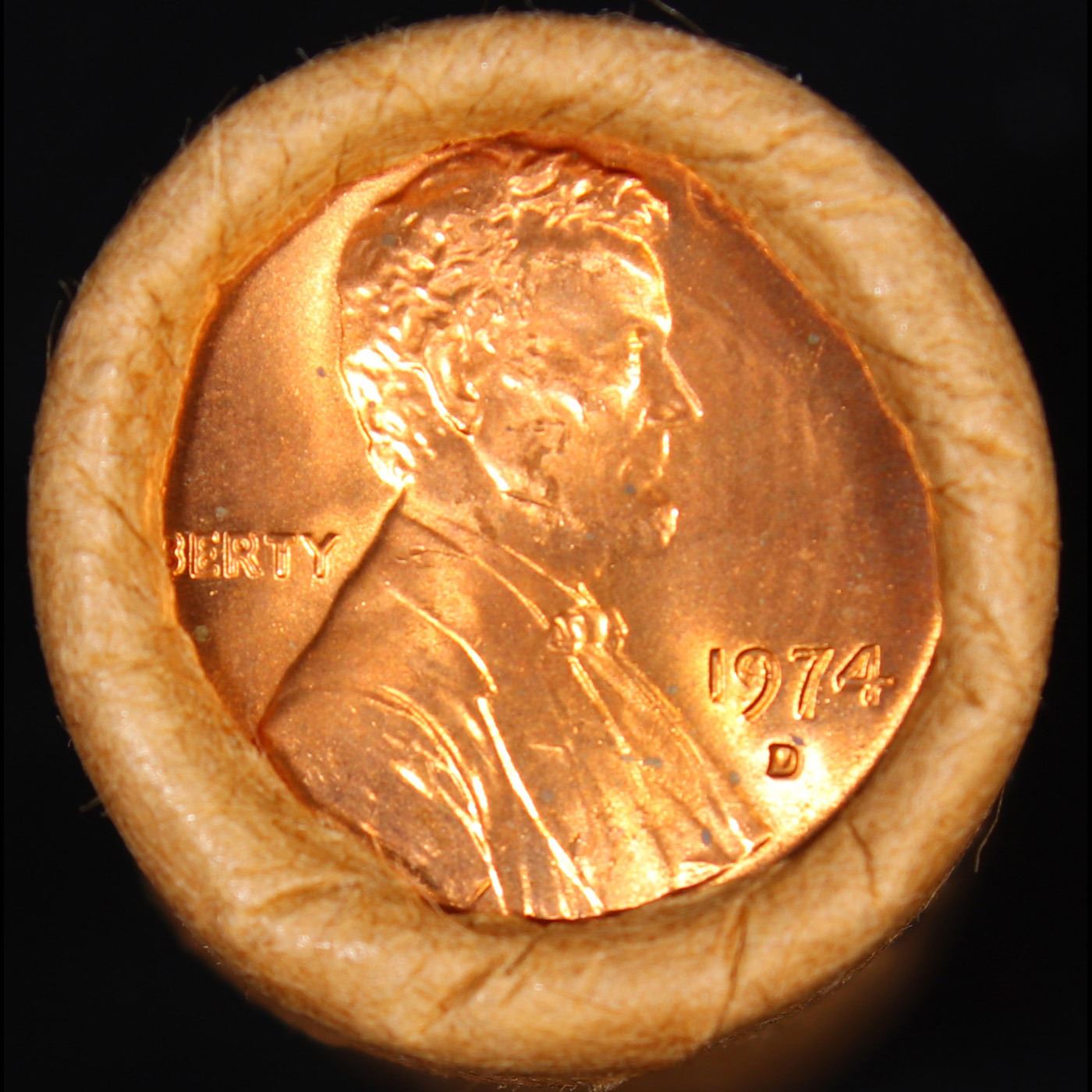 Shotgun Lincoln 1c roll, 1974-d 50 pcs Brandt Wrapper . A terrific Shotgun roll of Lincoln cents. All coins cherry red. Trends ms65 rd