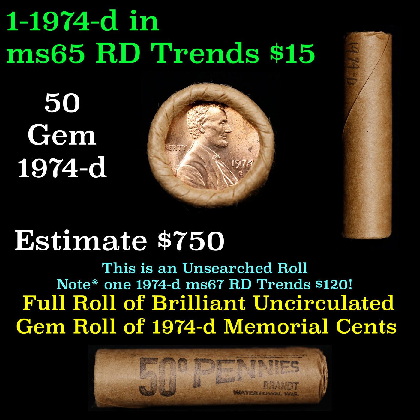 Shotgun Lincoln 1c roll, 1974-d 50 pcs Brandt Wrapper.. A terrific Shotgun roll of Lincoln cents. Most if not all coin should be cherry red.