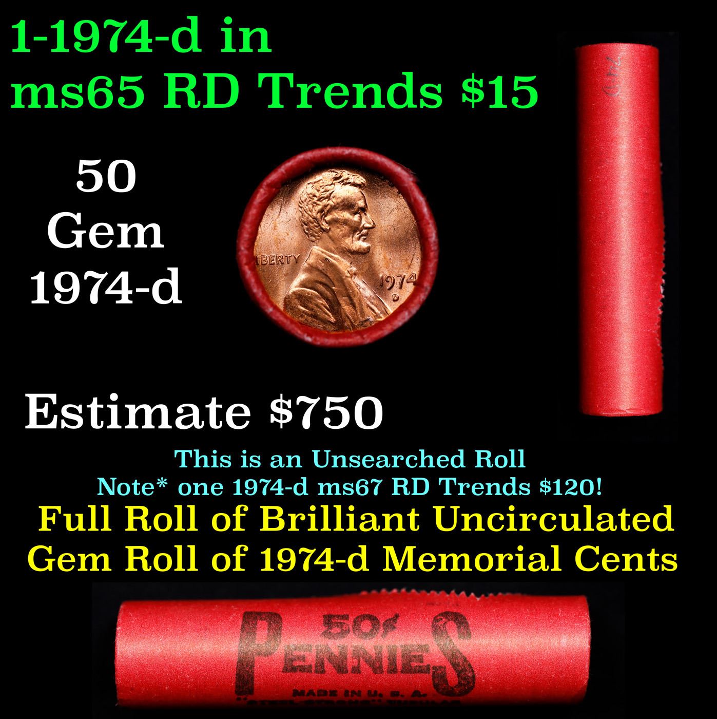 Shotgun Lincoln 1c roll, 1974-d 50 pcs Steel-Strong Wrapper.. A terrific Shotgun roll of Lincoln cents. Most if not all coin should be cherry red.