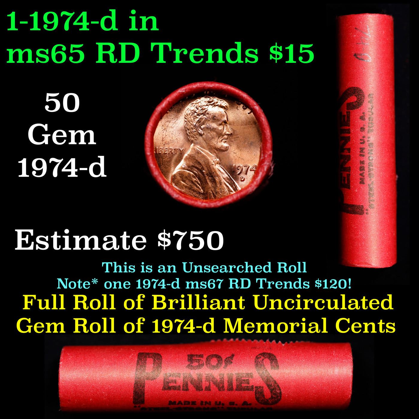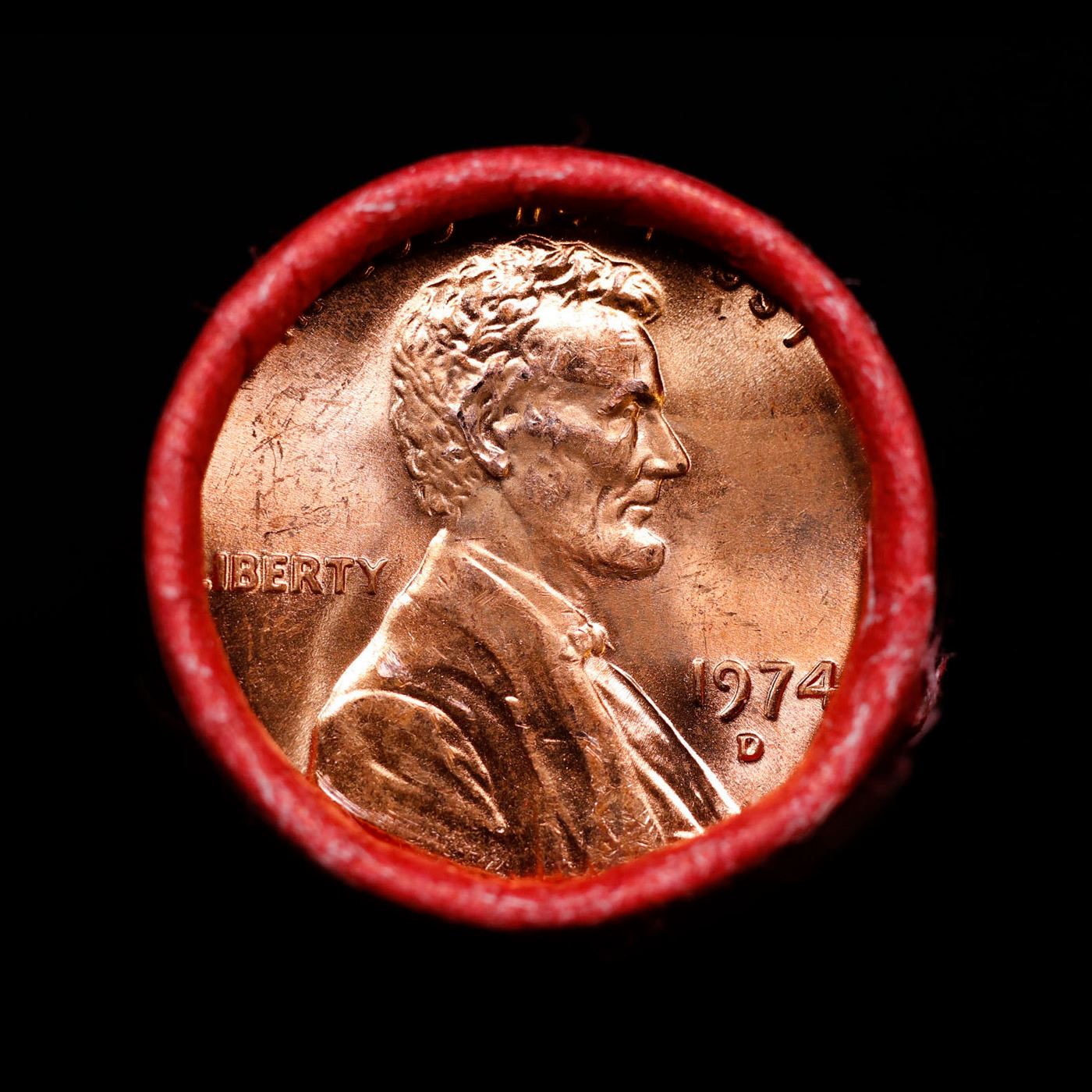 Shotgun Lincoln 1c roll, 1974-d 50 pcs Steel-Strong Wrapper.. A terrific Shotgun roll of Lincoln cents. Most if not all coin should be cherry red.