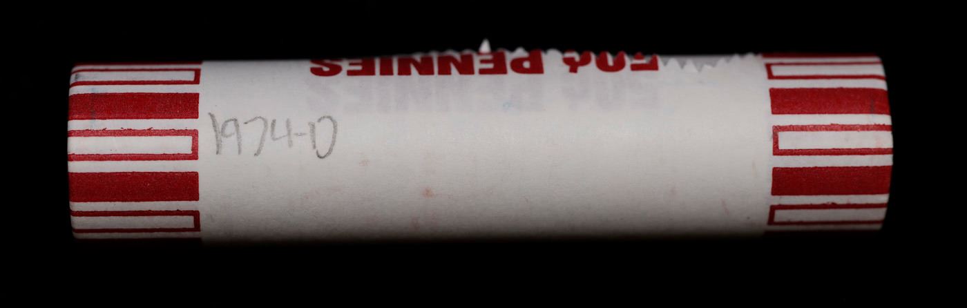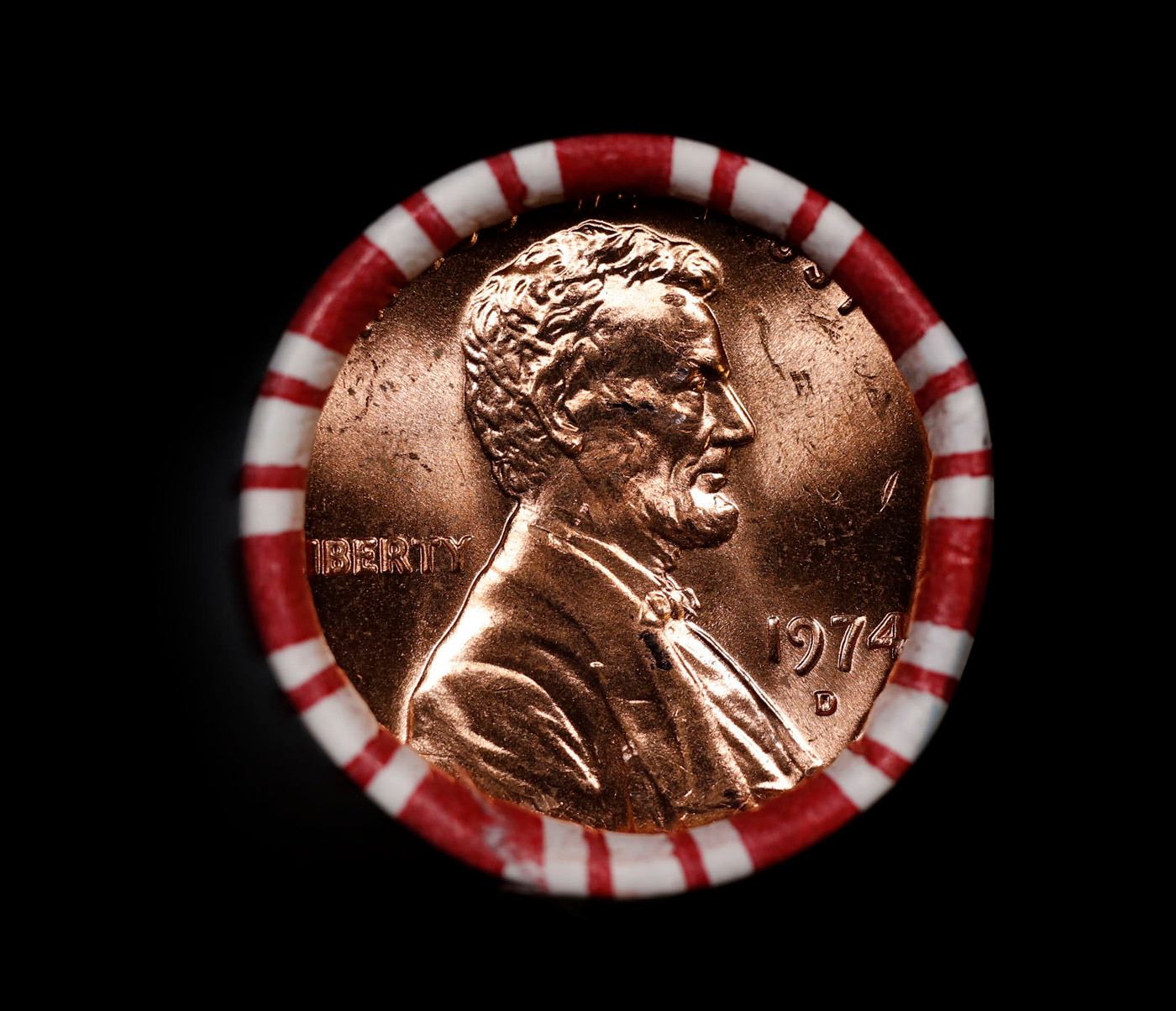 Shotgun Lincoln 1c roll, 1974-d 50 pcs Steel-Strong Wrapper.. A terrific Shotgun roll of Lincoln cents. Most if not all coin should be cherry red.