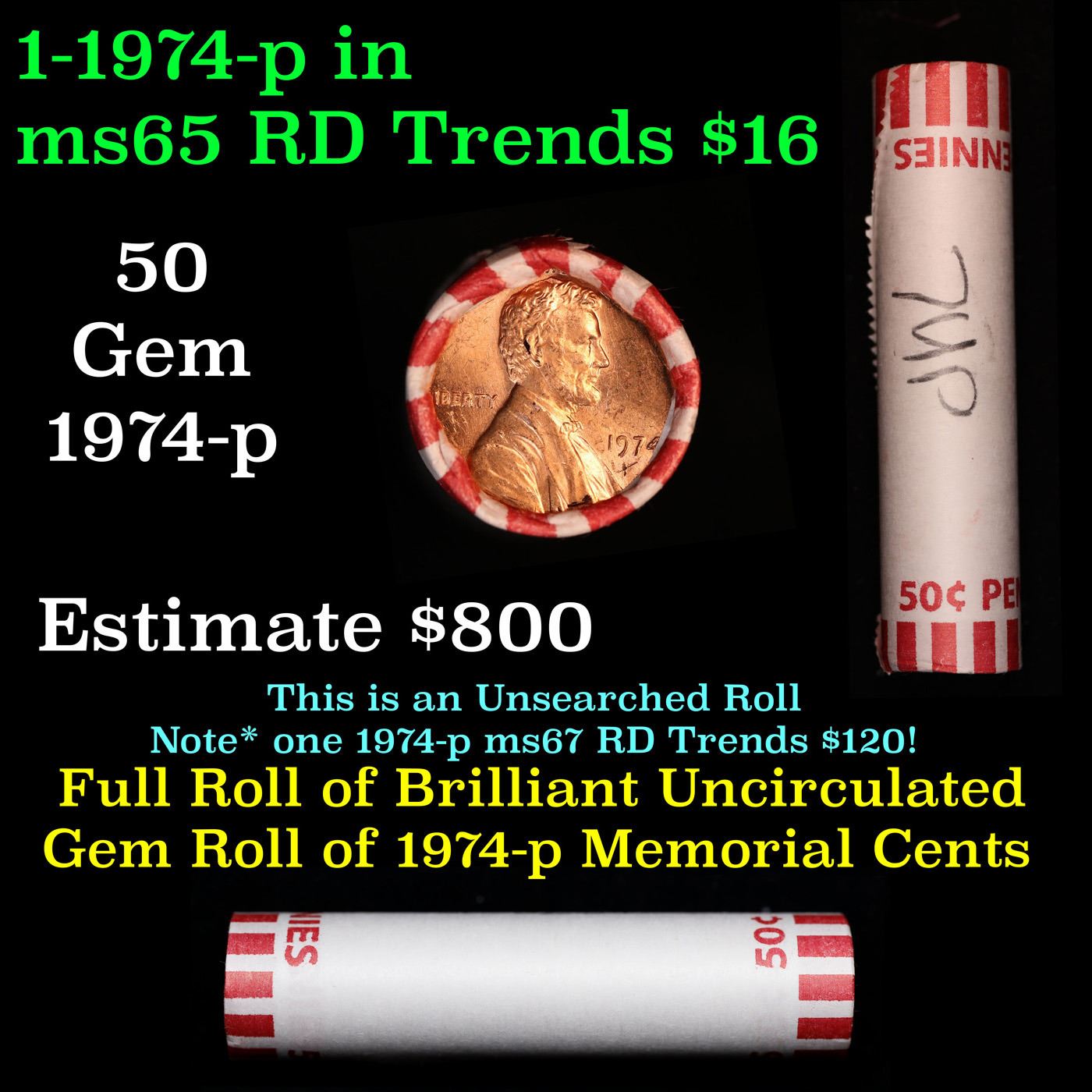 Shotgun Lincoln 1c roll, 1974-p 50 pcs Bank Wrapper.. A terrific Shotgun roll of Lincoln cents. Most if not all coin should be cherry red.