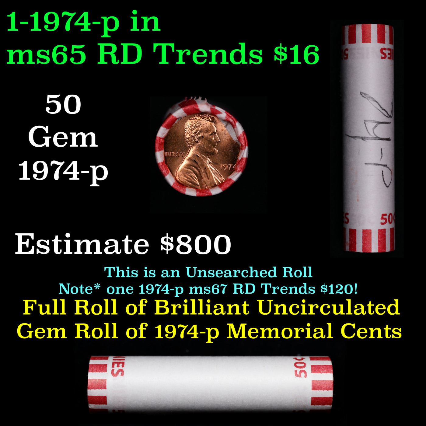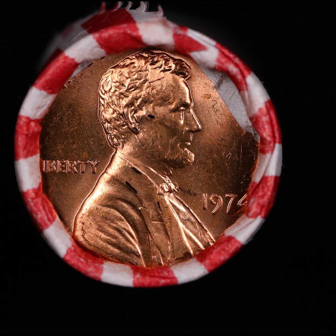 Shotgun Lincoln 1c roll, 1974-p 50 pcs Bank Wrapper.. A terrific Shotgun roll of Lincoln cents. Most if not all coin should be cherry red.