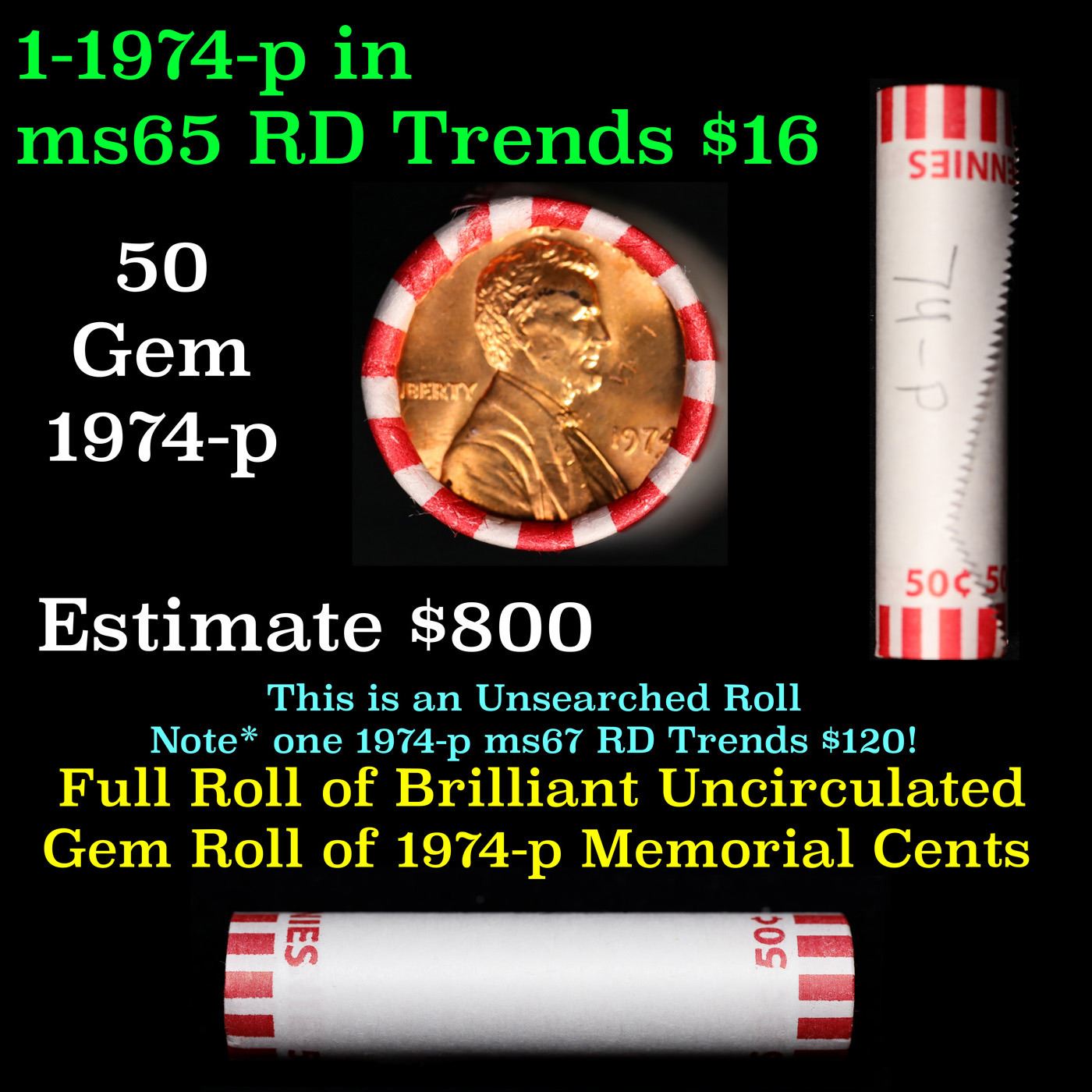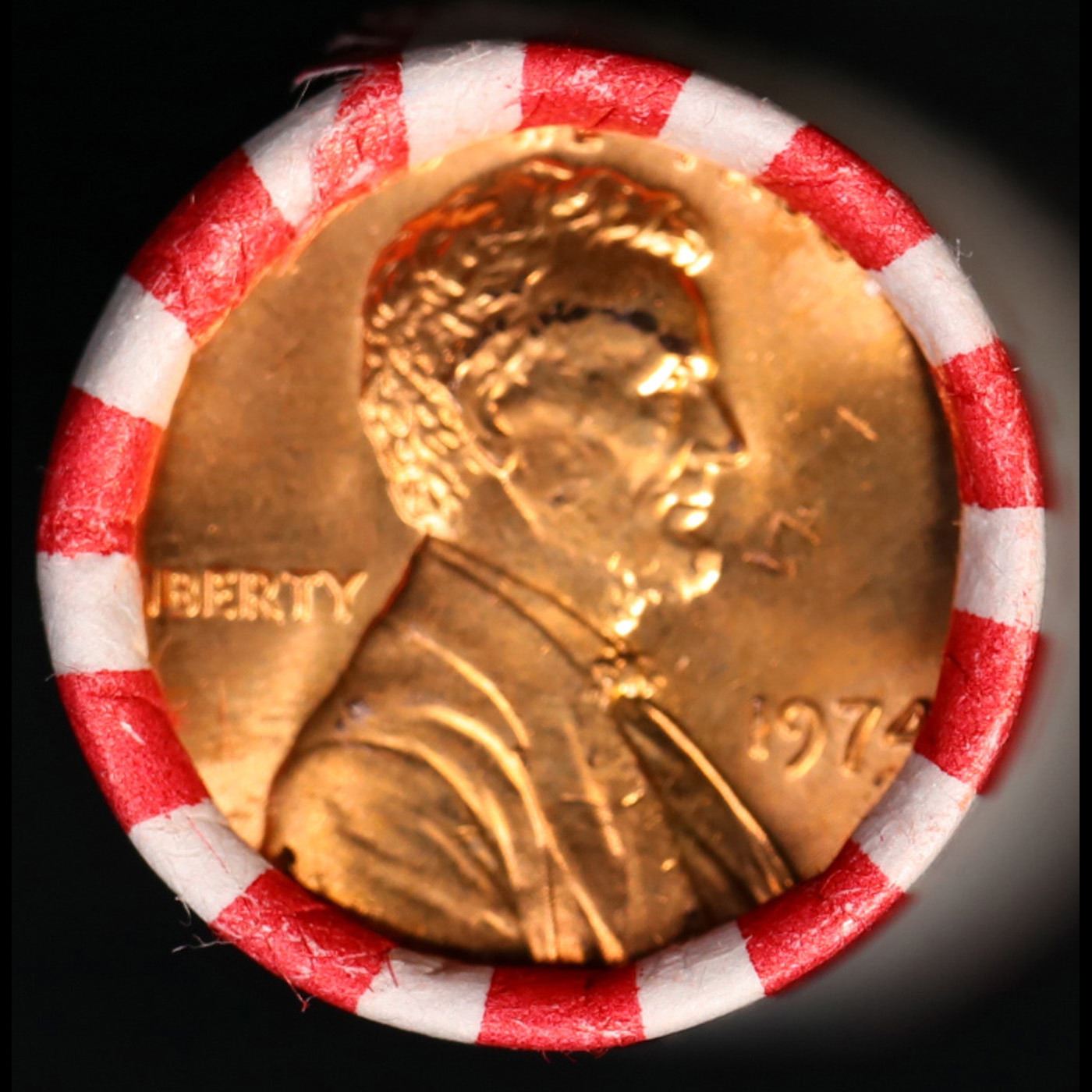 Shotgun Lincoln 1c roll, 1974-p 50 pcs Bank Wrapper.. A terrific Shotgun roll of Lincoln cents. Most if not all coin should be cherry red.