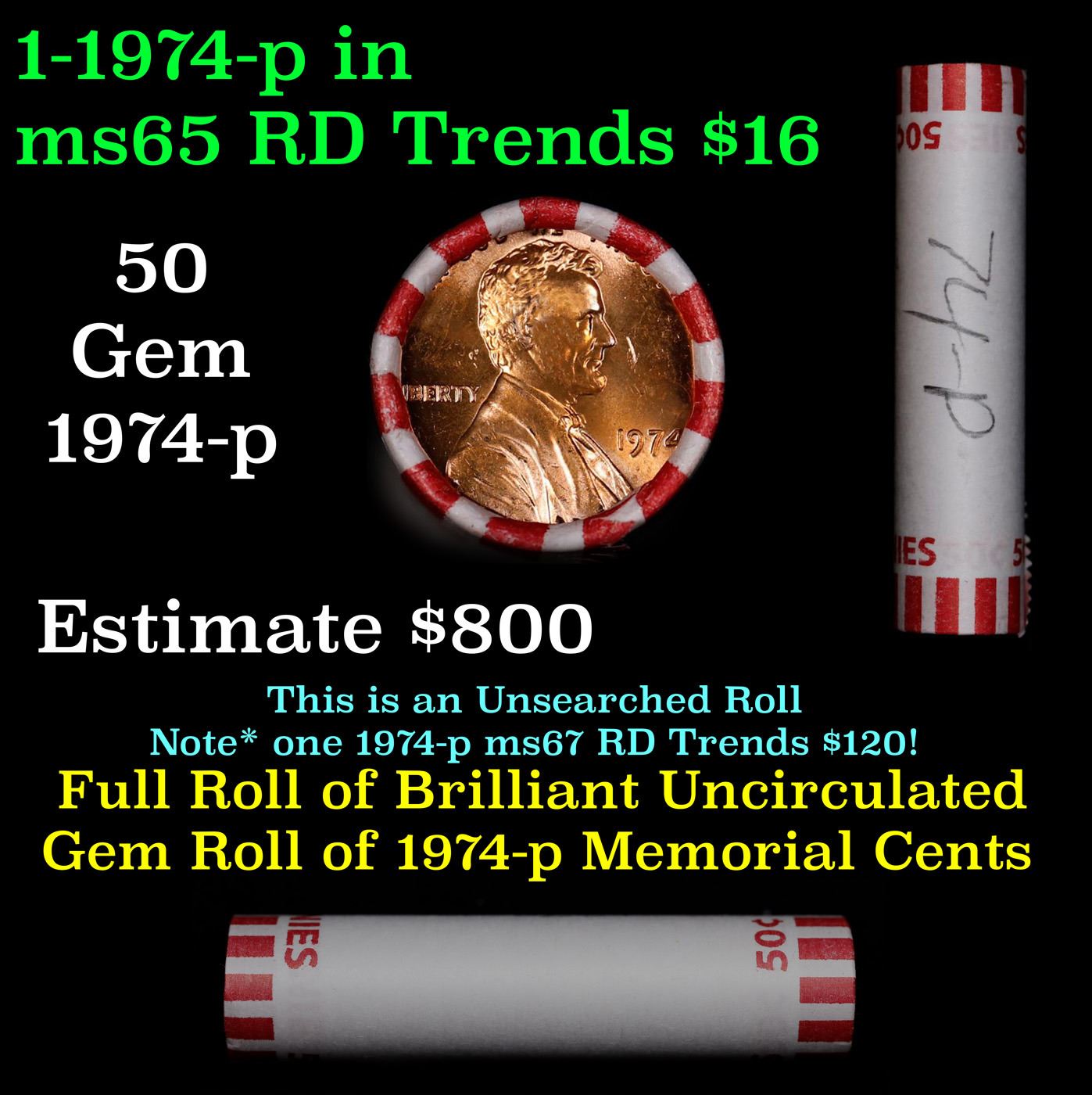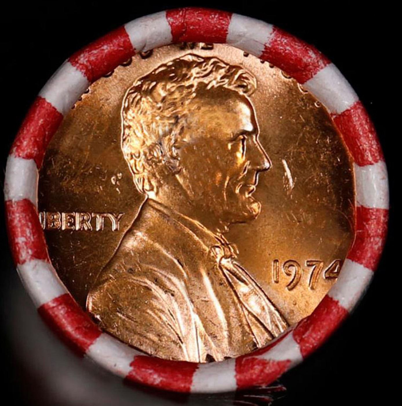 Shotgun Lincoln 1c roll, 1974-p 50 pcs Bank Wrapper.. A terrific Shotgun roll of Lincoln cents. Most if not all coin should be cherry red.