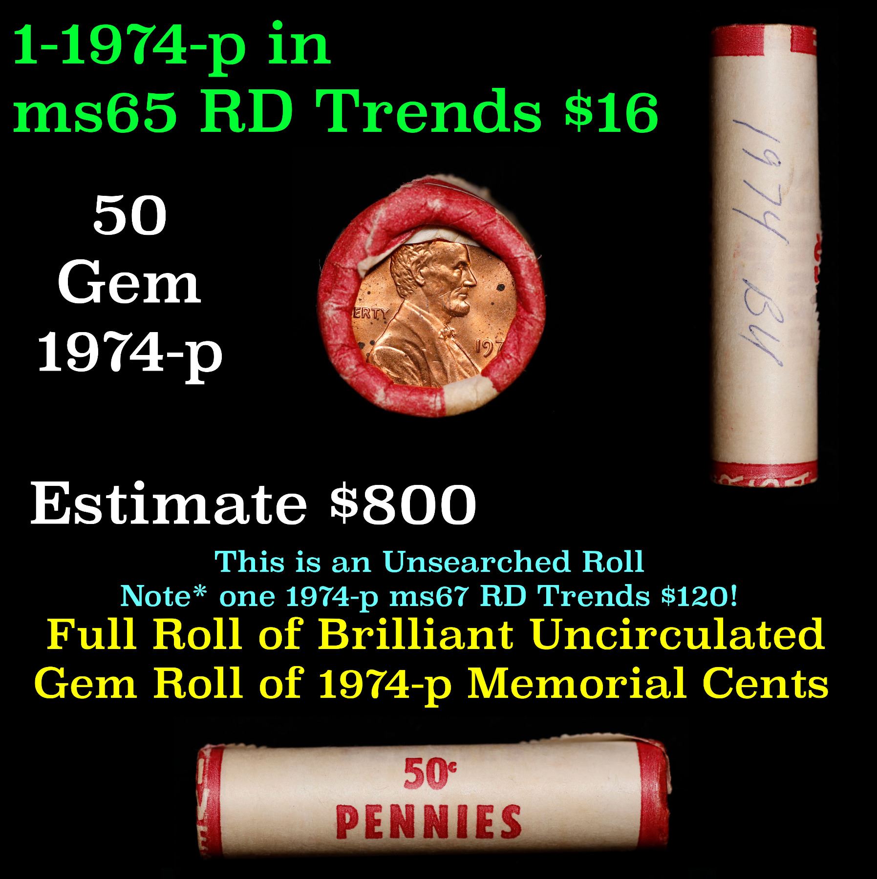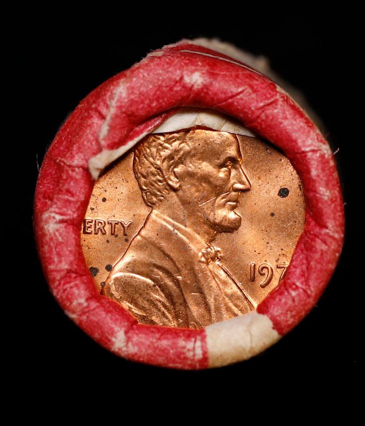 Shotgun Lincoln 1c roll, 1974-p 50 pcs Bank Wrapper.. A terrific Shotgun roll of Lincoln cents. Most if not all coin should be cherry red.