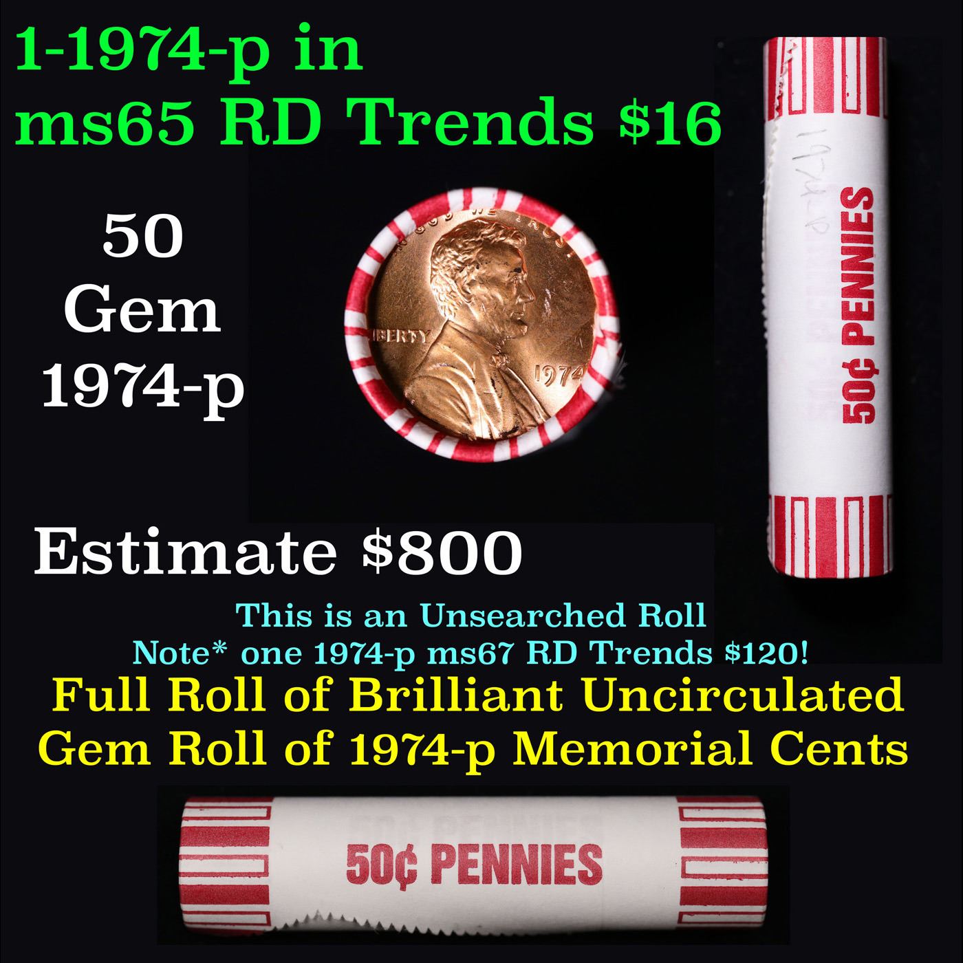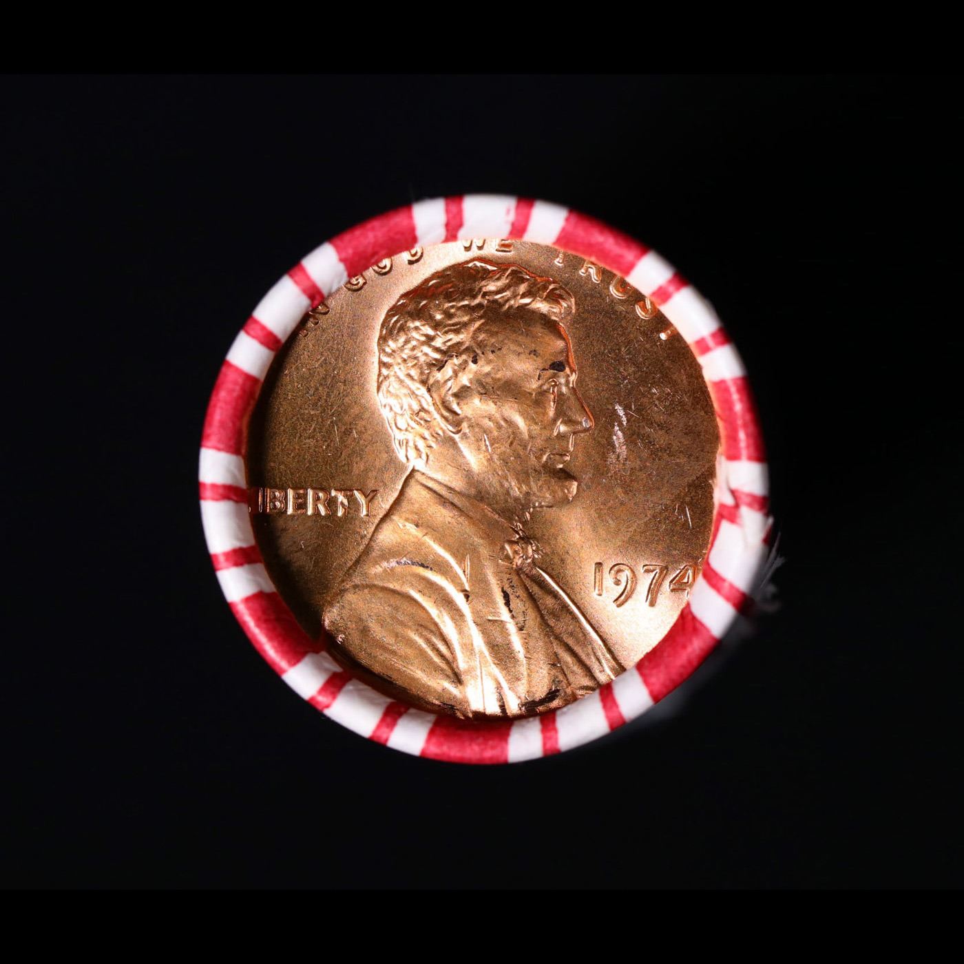 Shotgun Lincoln 1c roll, 1974-p 50 pcs Brandt 50c Wrapper.. A terrific Shotgun roll of Lincoln cents. Most if not all coin should be cherry red.