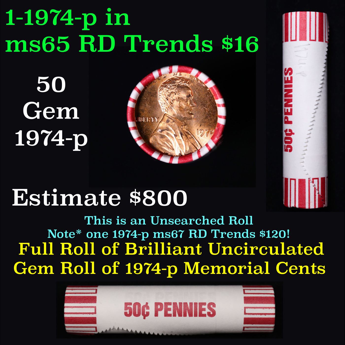 Shotgun Lincoln 1c roll, 1974-p 50 pcs Brandt 50c Wrapper.. A terrific Shotgun roll of Lincoln cents. Most if not all coin should be cherry red.
