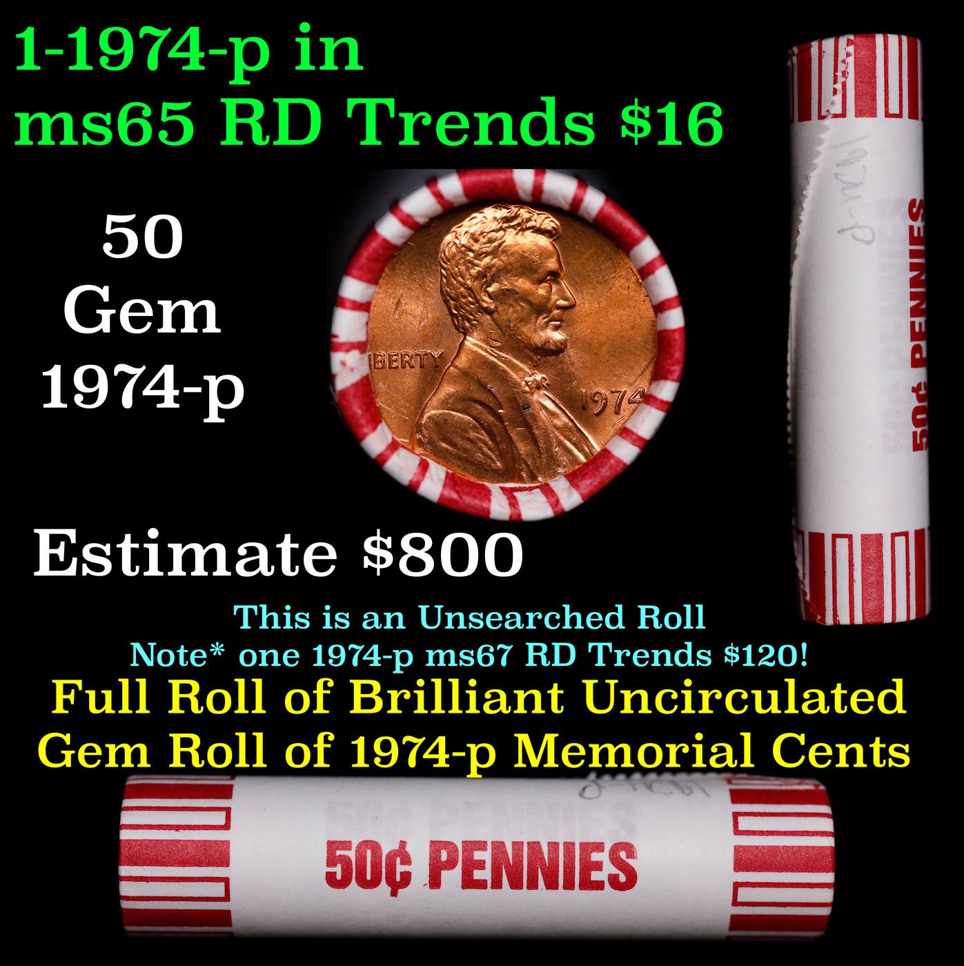 Shotgun Lincoln 1c roll, 1974-p 50 pcs Brandt 50c Wrapper.. A terrific Shotgun roll of Lincoln cents. Most if not all coin should be cherry red.
