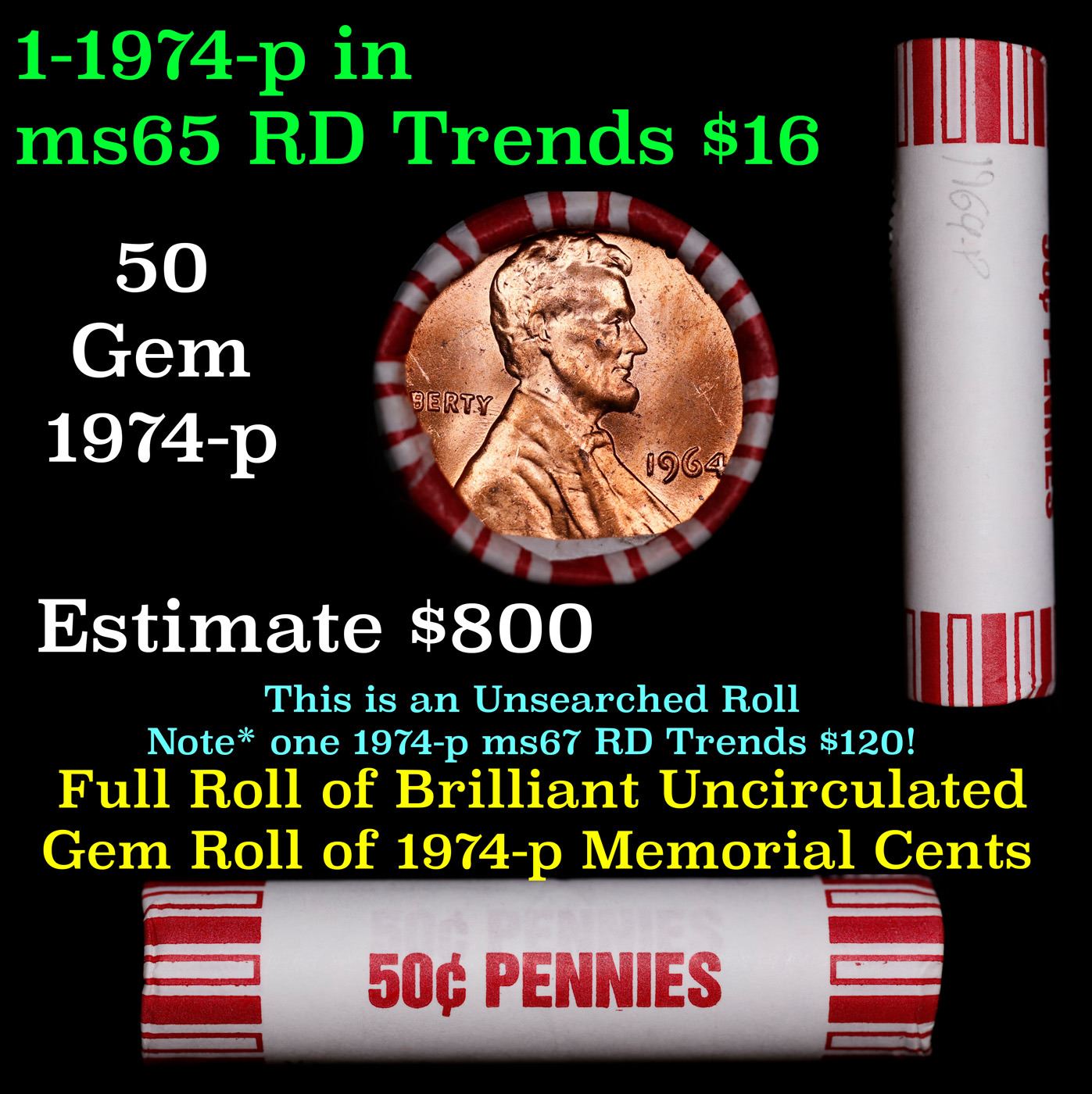 Shotgun Lincoln 1c roll, 1974-p 50 pcs Brandt 50c Wrapper.. A terrific Shotgun roll of Lincoln cents. Most if not all coin should be cherry red.