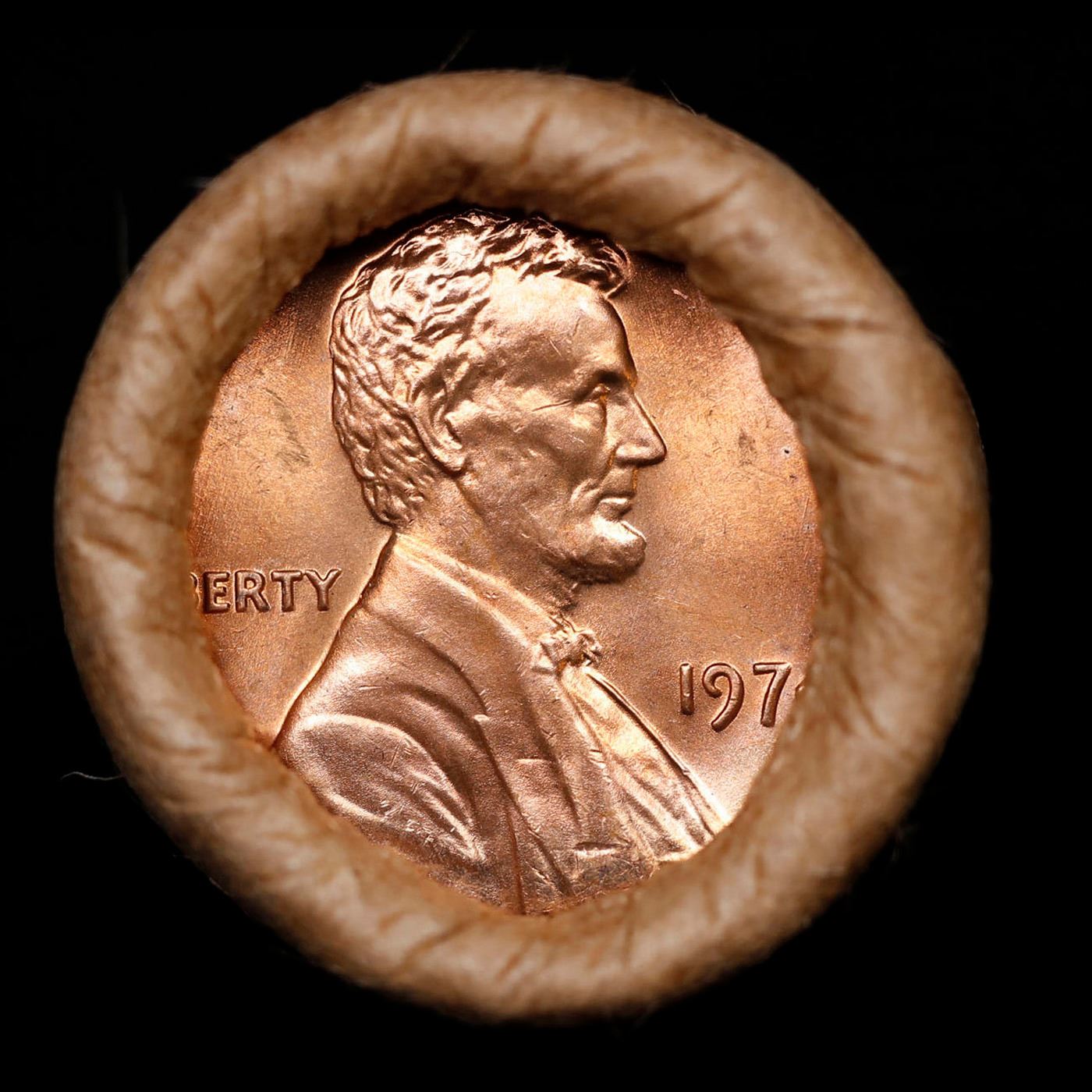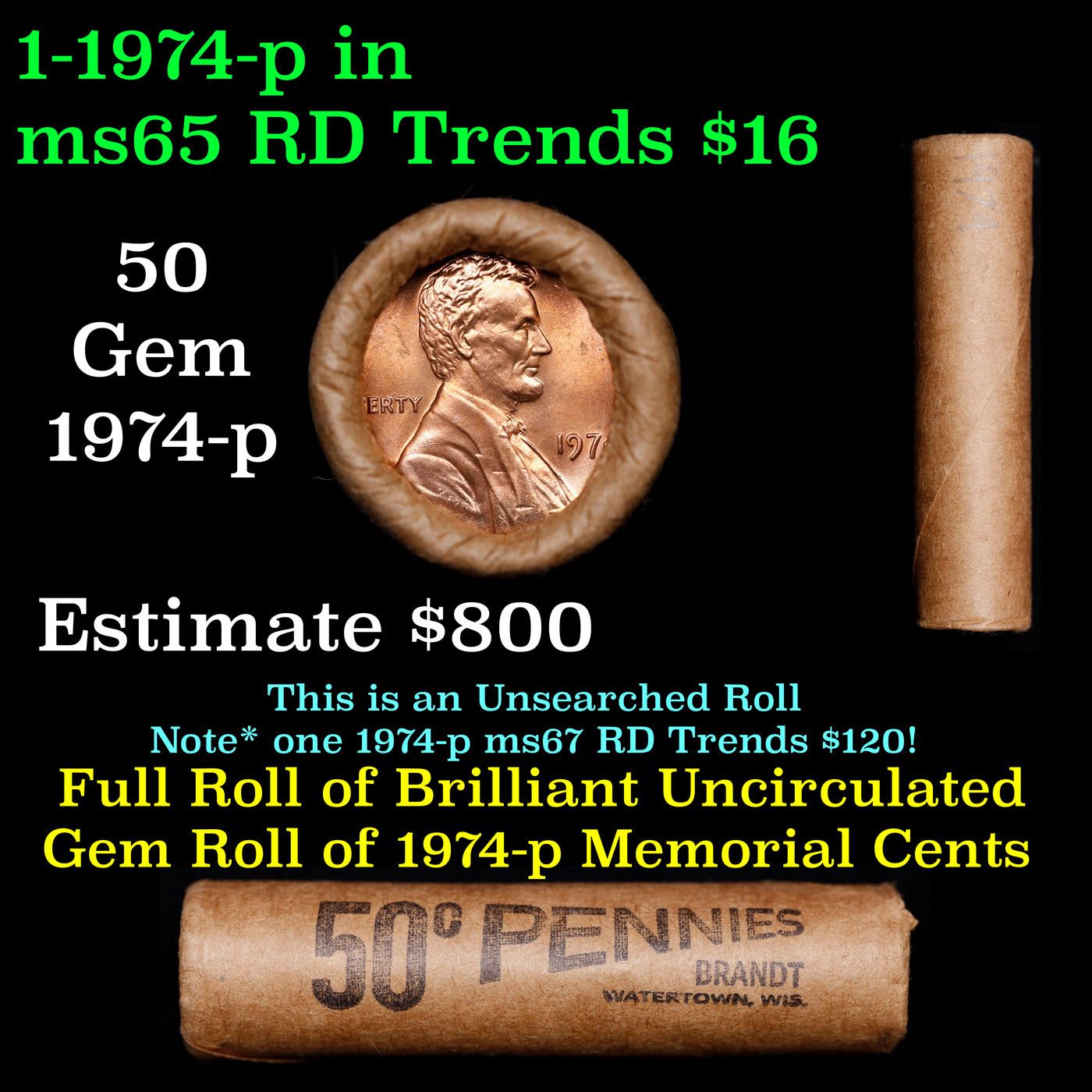 Shotgun Lincoln 1c roll, 1974-p 50 pcs Brandt Wrapper.. A terrific Shotgun roll of Lincoln cents. Most if not all coin should be cherry red.