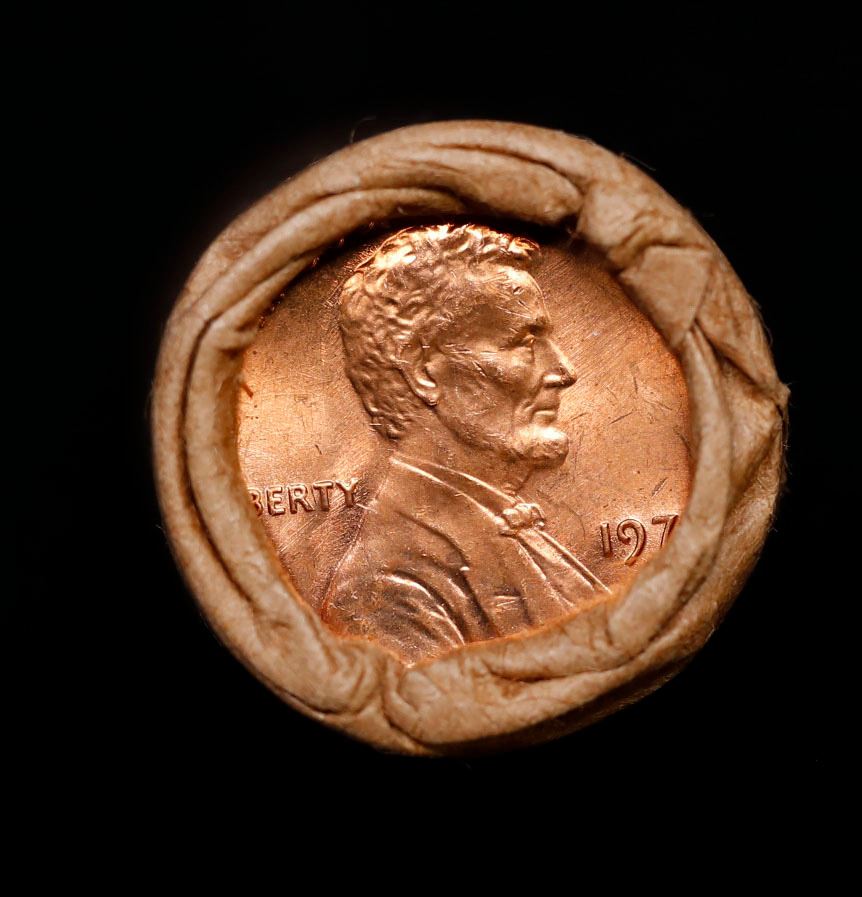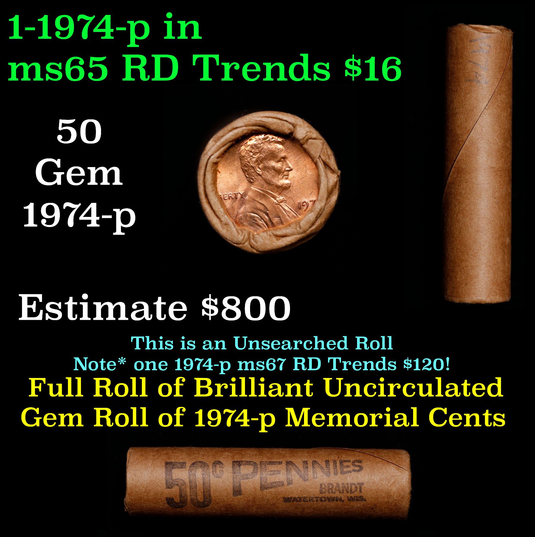 Shotgun Lincoln 1c roll, 1974-p 50 pcs Brandt Wrapper.. A terrific Shotgun roll of Lincoln cents. Most if not all coin should be cherry red.