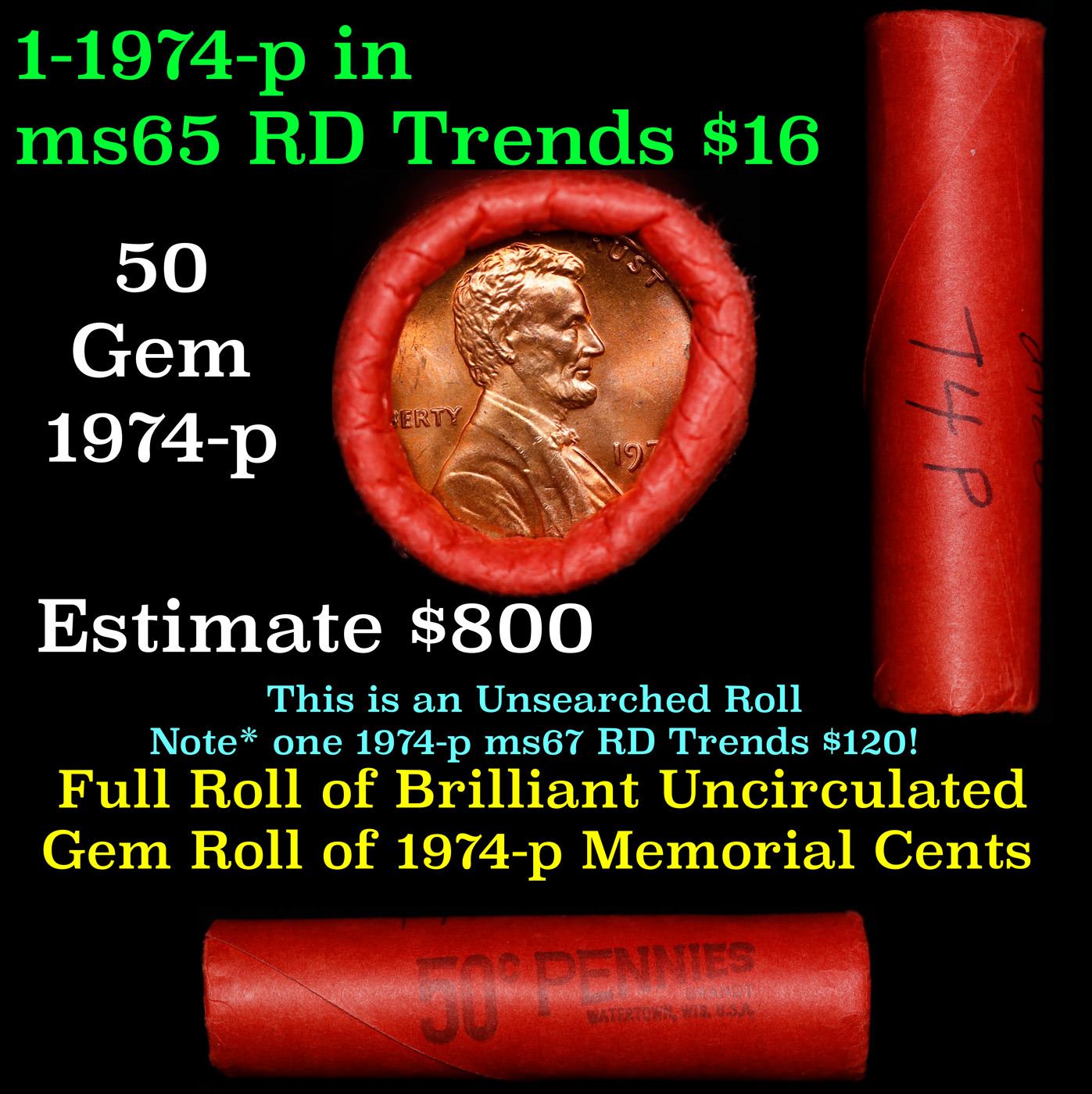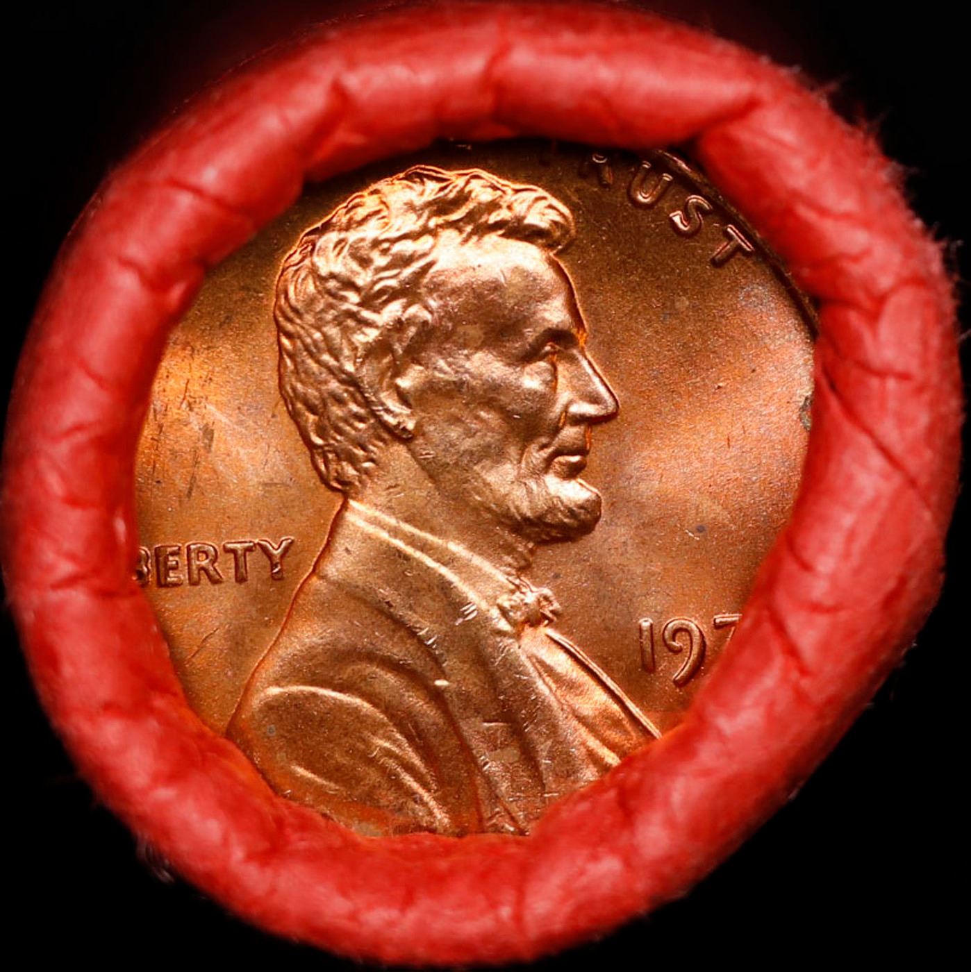 Shotgun Lincoln 1c roll, 1974-p 50 pcs Brandt Wrapper.. A terrific Shotgun roll of Lincoln cents. Most if not all coin should be cherry red.