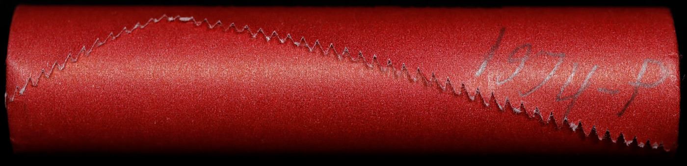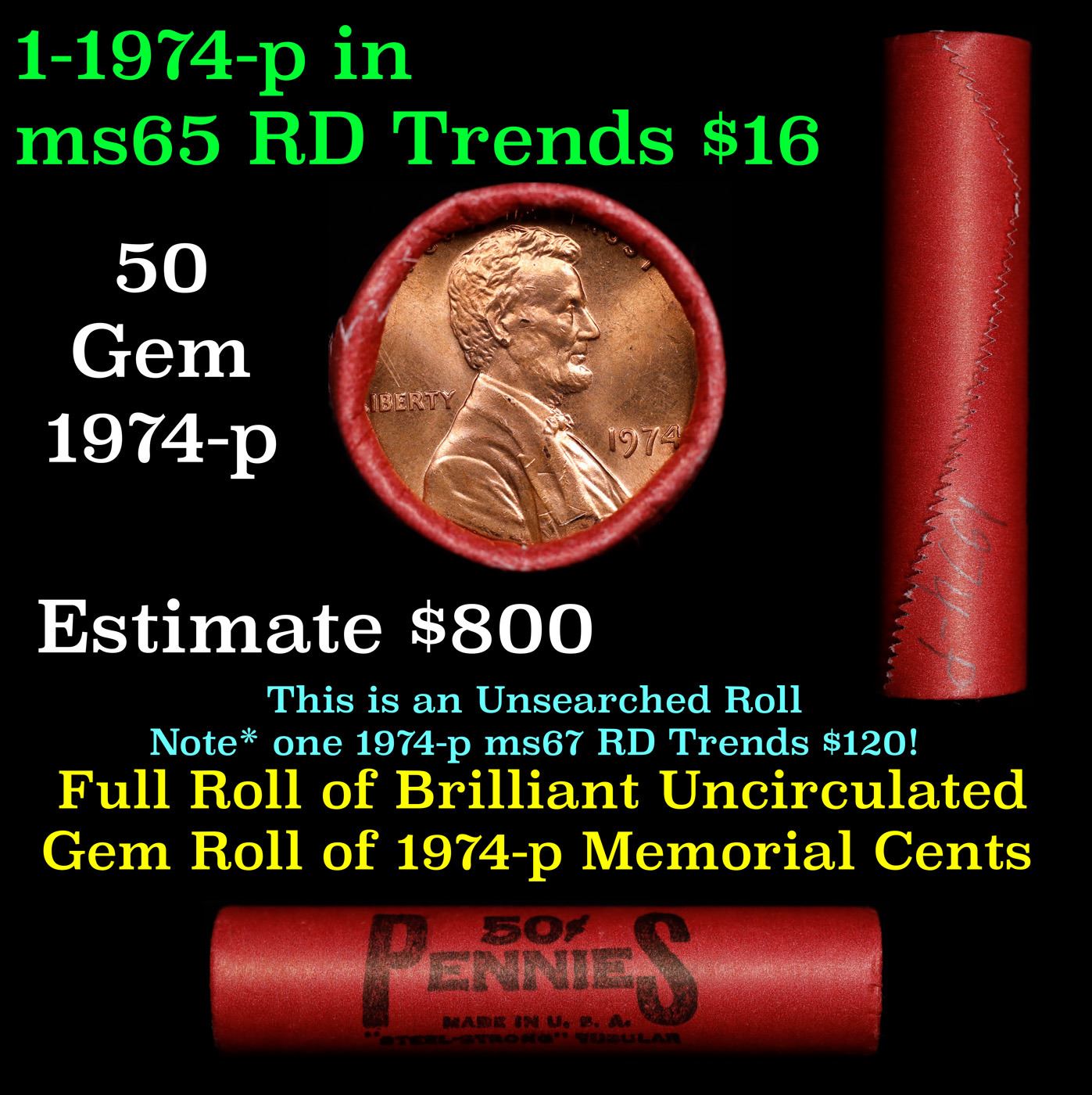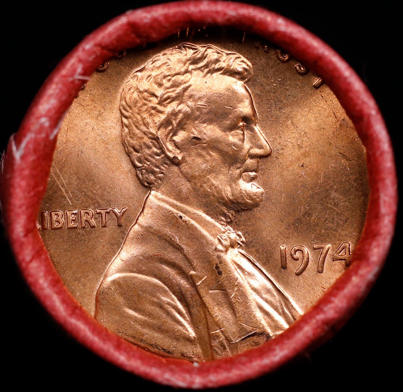 Shotgun Lincoln 1c roll, 1974-p 50 pcs Steel-Strong 50c Wrapper.. A terrific Shotgun roll of Lincoln cents. Most if not all coin should be cherry red.