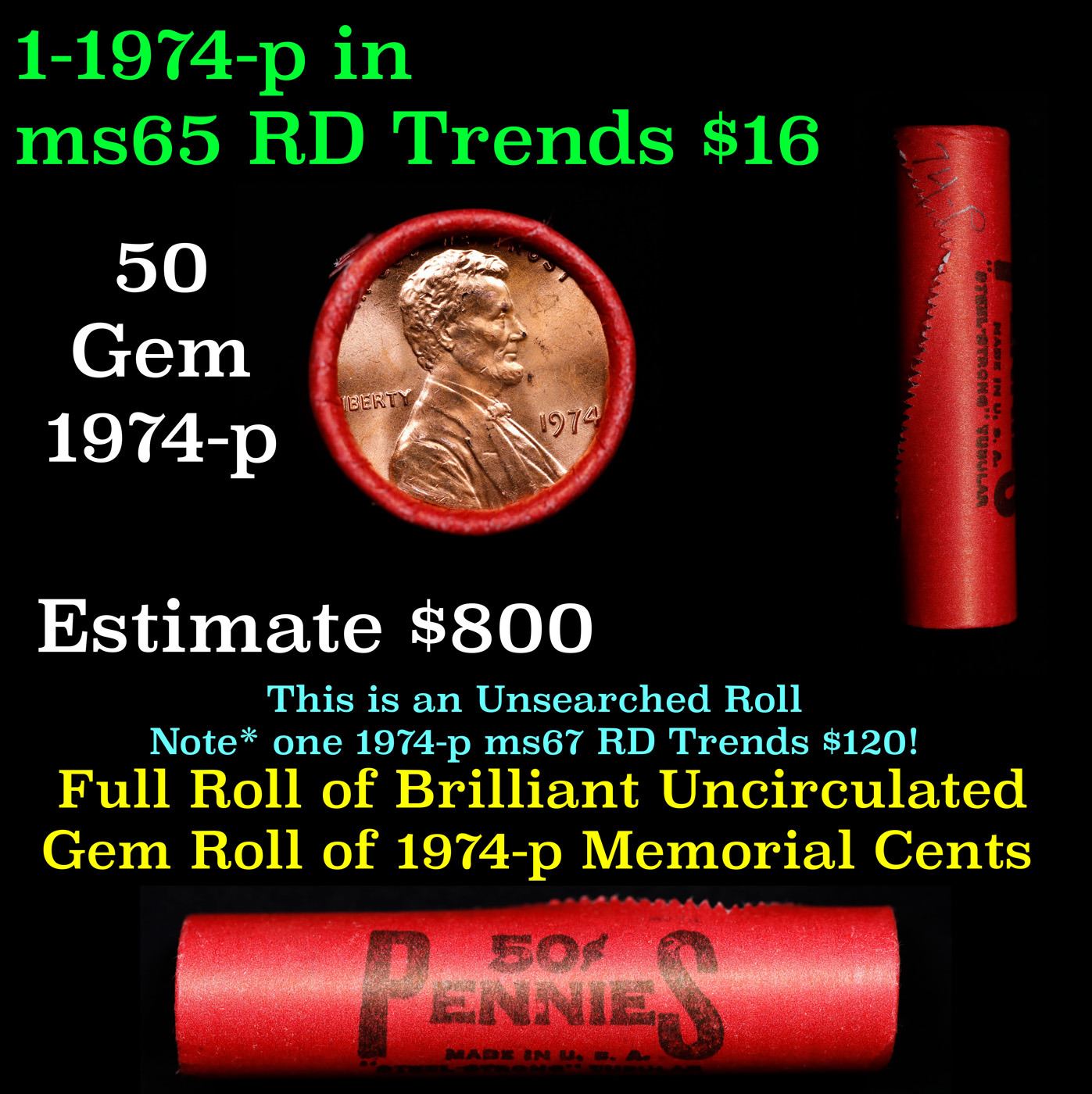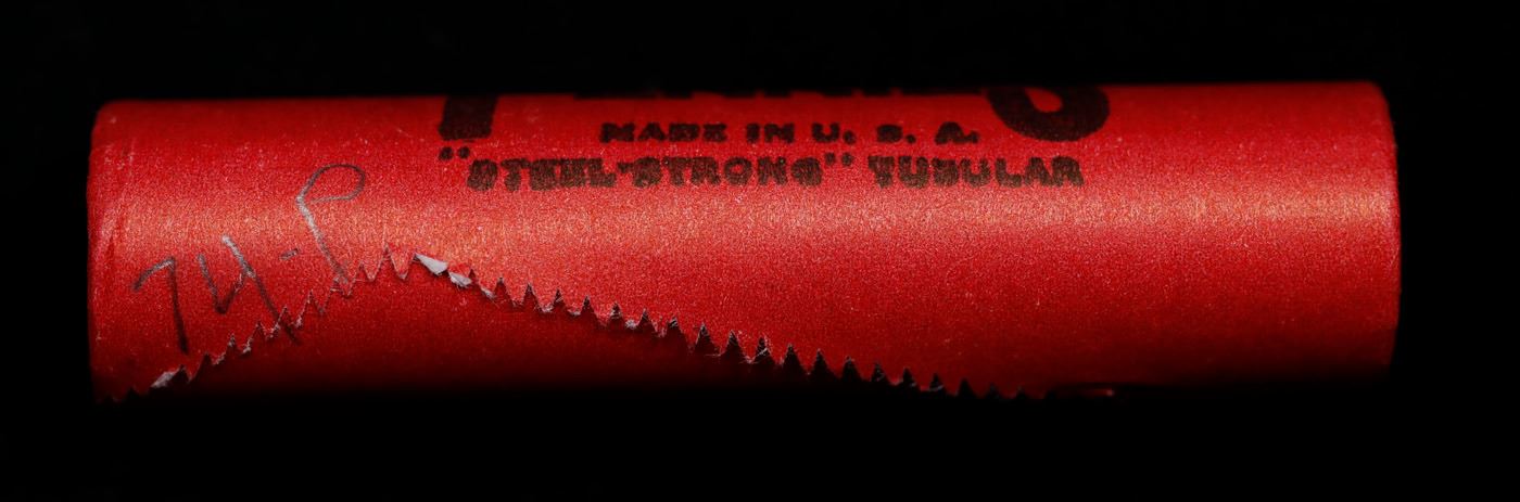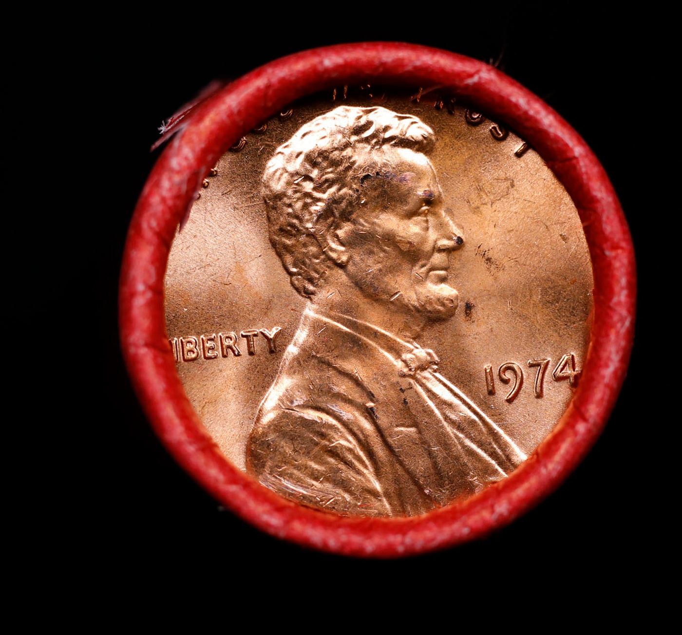 Shotgun Lincoln 1c roll, 1974-p 50 pcs Steel-Strong Wrapper.. A terrific Shotgun roll of Lincoln cents. Most if not all coin should be cherry red.