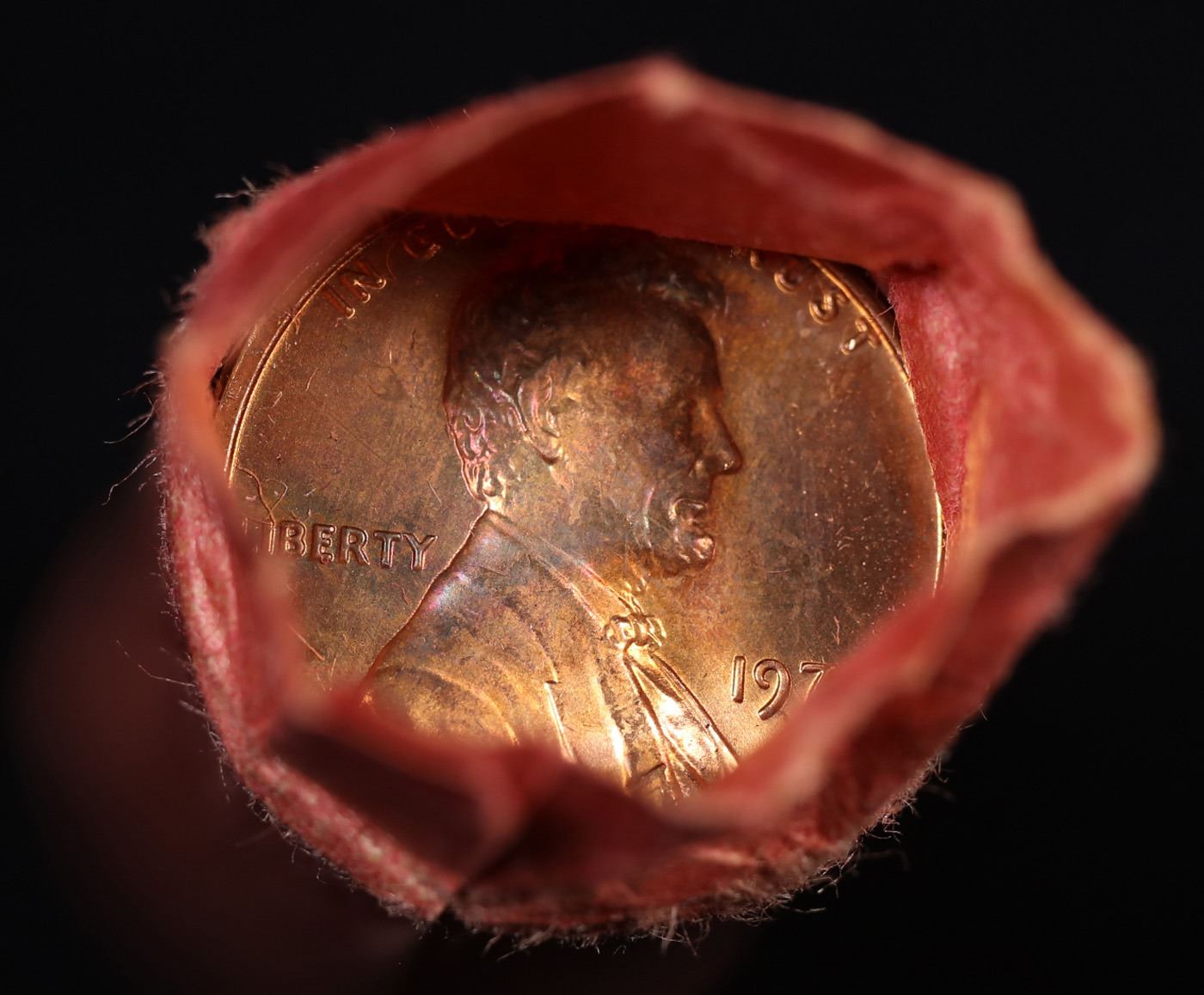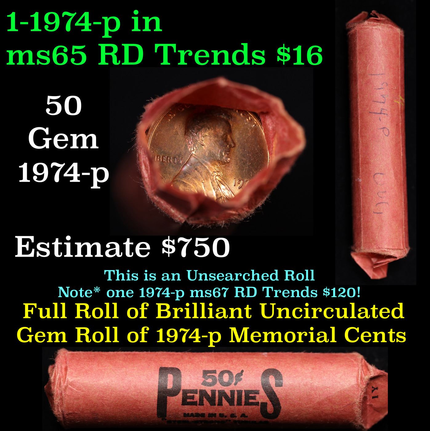 Shotgun Lincoln 1c roll, 1974-p 50 pcs Wrapper . A terrific Shotgun roll of Lincoln cents. All coins cherry red. Trends ms65 rd $18