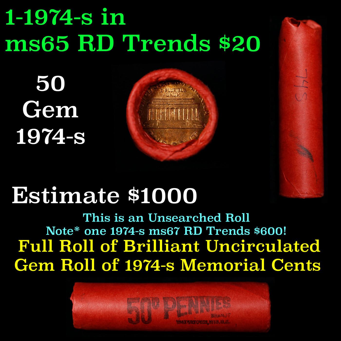 Shotgun Lincoln 1c roll, 1974-s 50 pcs Brandt Wrapper.. A terrific Shotgun roll of Lincoln cents. Most if not all coin should be cherry red.