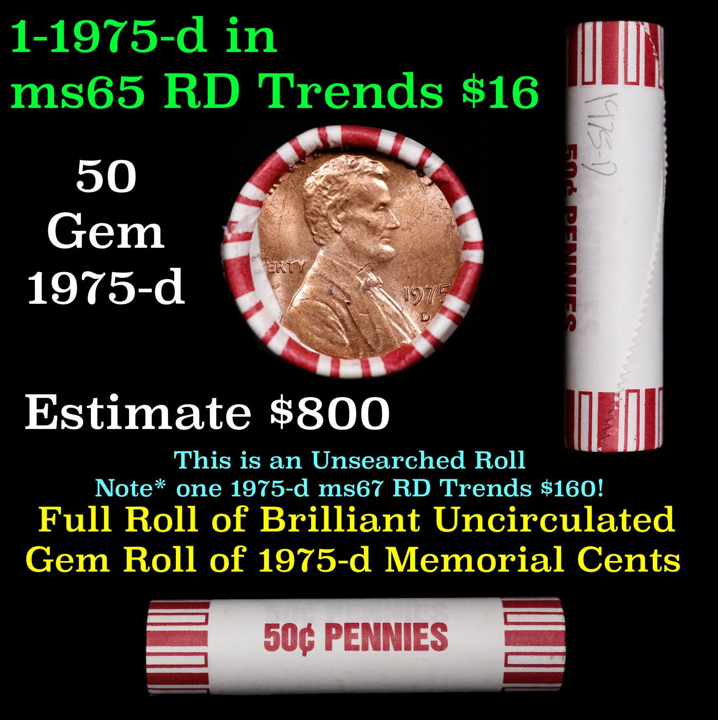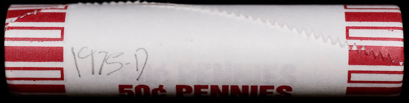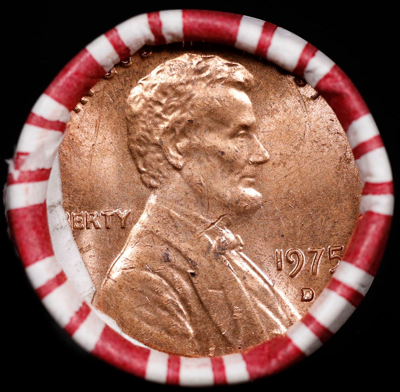 Shotgun Lincoln 1c roll, 1975-d 50 pcs Bank 50c Wrapper.. A terrific Shotgun roll of Lincoln cents. Most if not all coin should be cherry red.