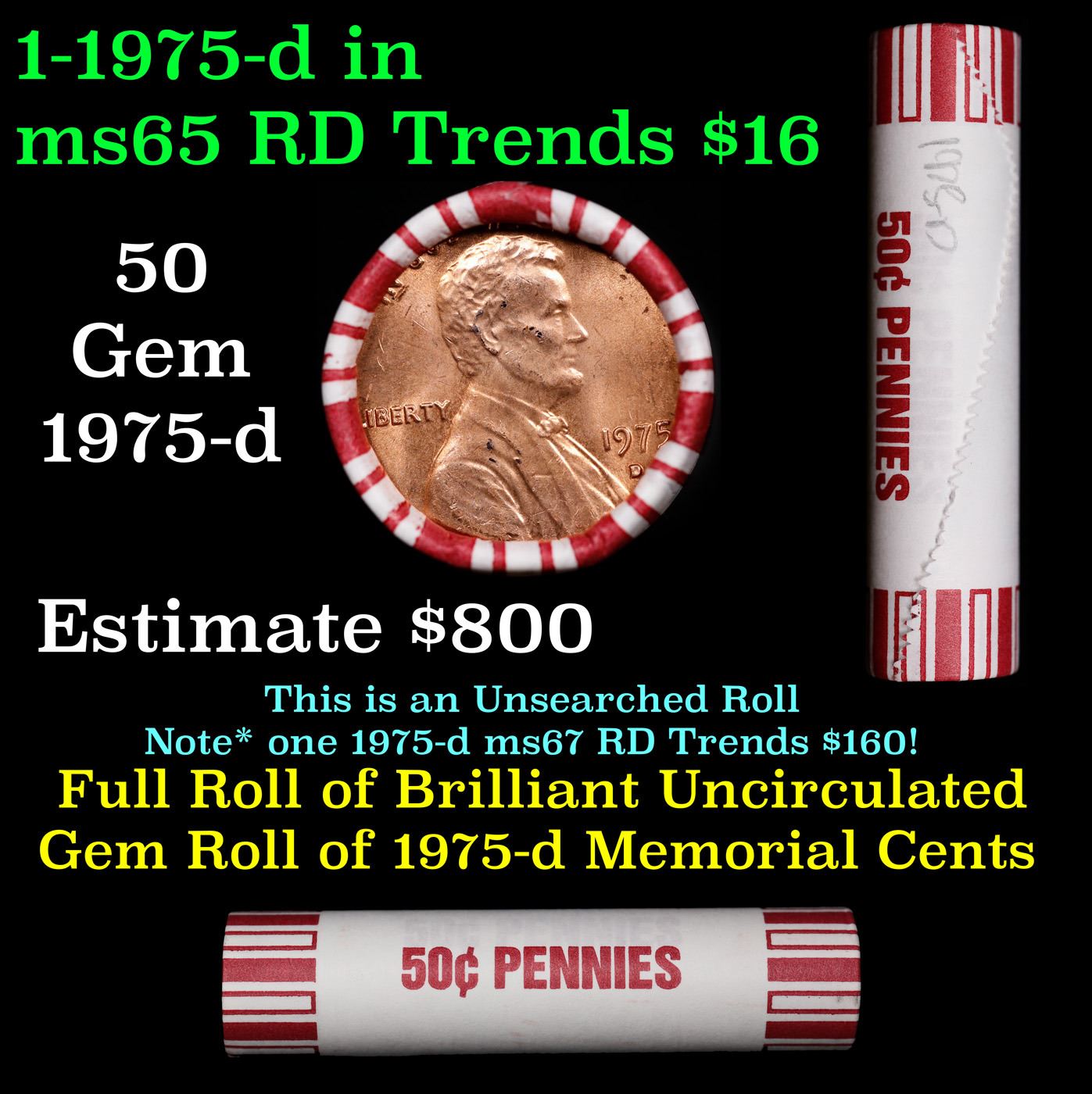 Shotgun Lincoln 1c roll, 1975-d 50 pcs Bank 50c Wrapper.. A terrific Shotgun roll of Lincoln cents. Most if not all coin should be cherry red.