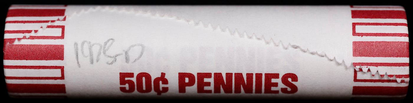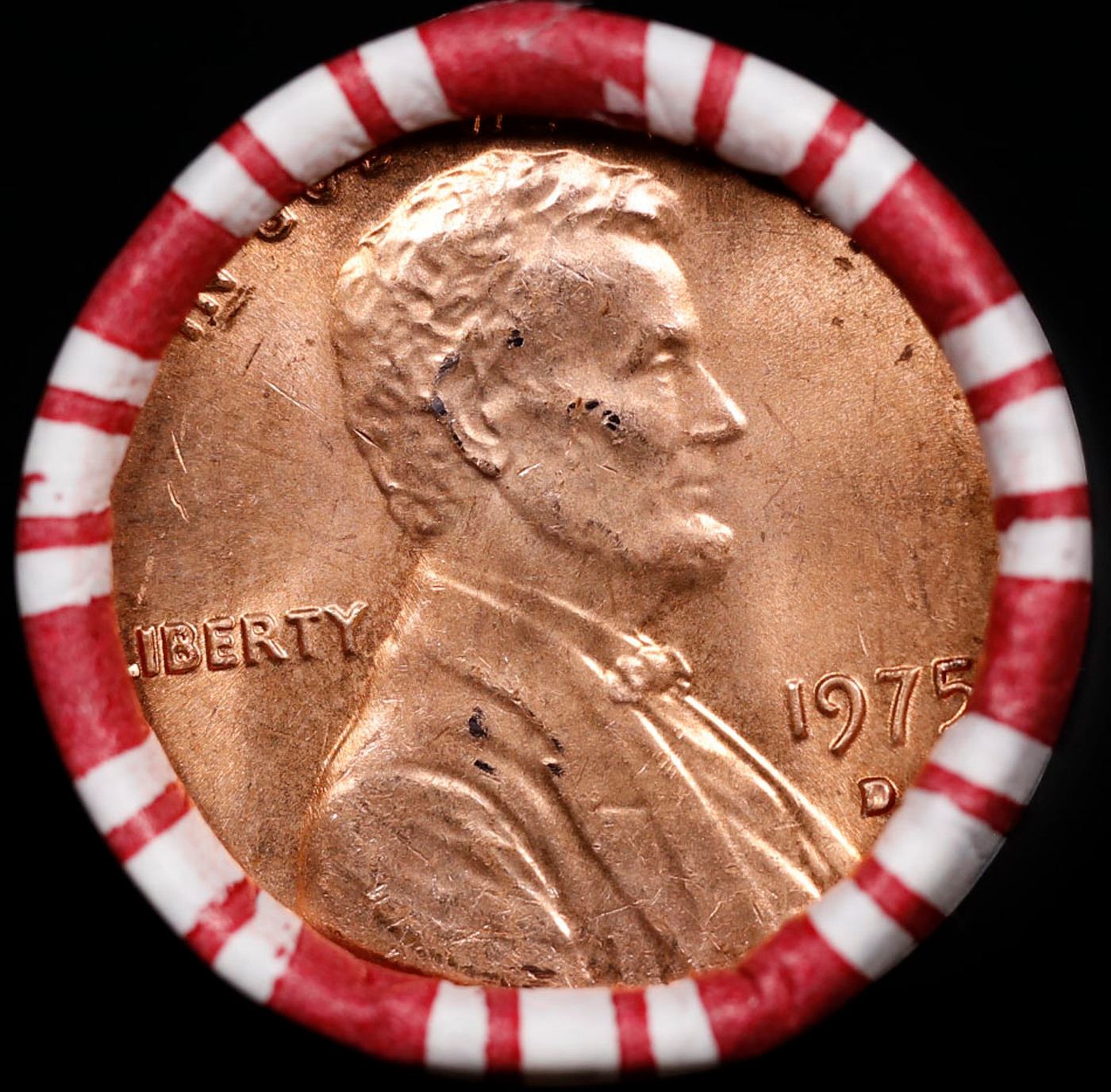 Shotgun Lincoln 1c roll, 1975-d 50 pcs Bank 50c Wrapper.. A terrific Shotgun roll of Lincoln cents. Most if not all coin should be cherry red.
