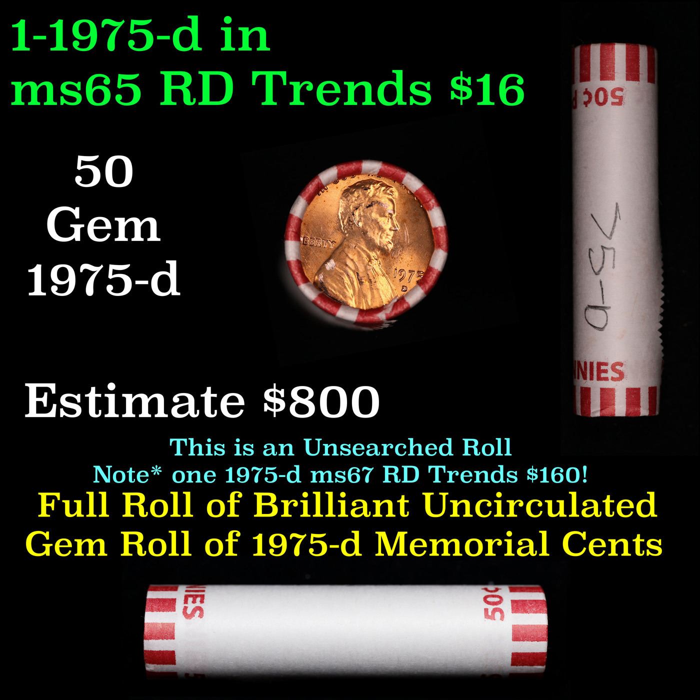 Shotgun Lincoln 1c roll, 1975-d 50 pcs Bank Wrapper.. A terrific Shotgun roll of Lincoln cents. Most if not all coin should be cherry red.
