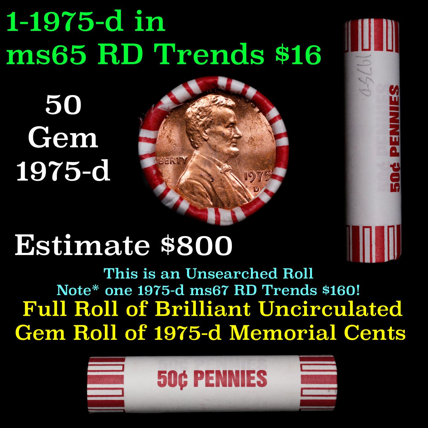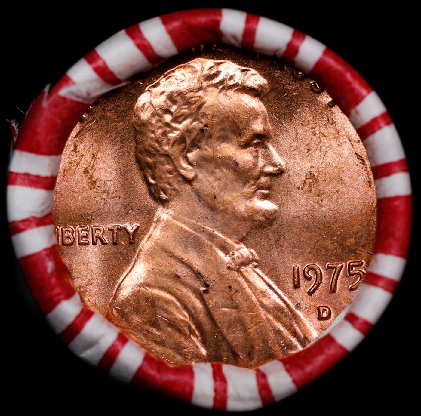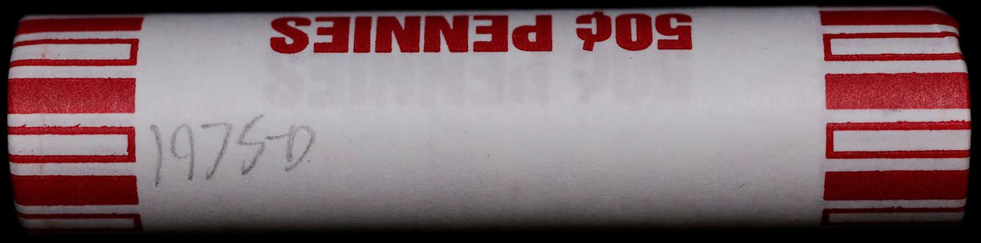 Shotgun Lincoln 1c roll, 1975-d 50 pcs Brandt 50c Wrapper.. A terrific Shotgun roll of Lincoln cents. Most if not all coin should be cherry red.