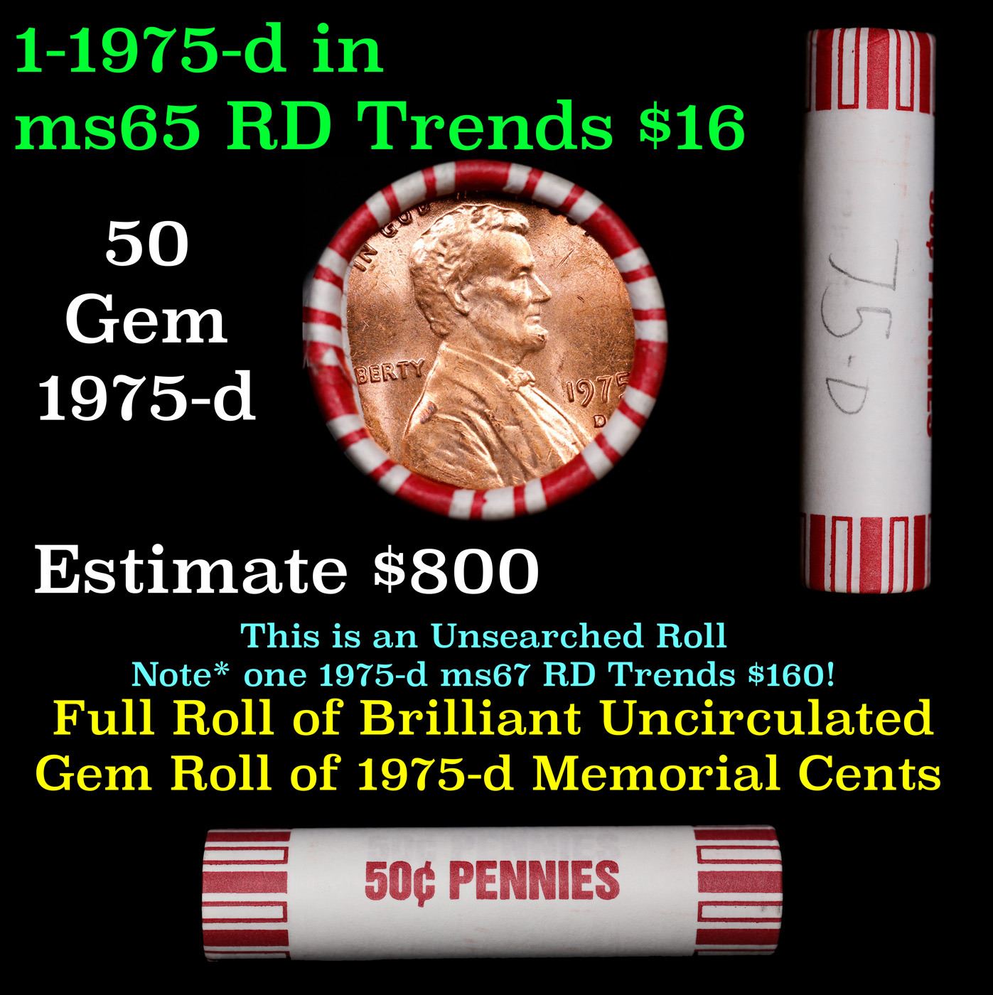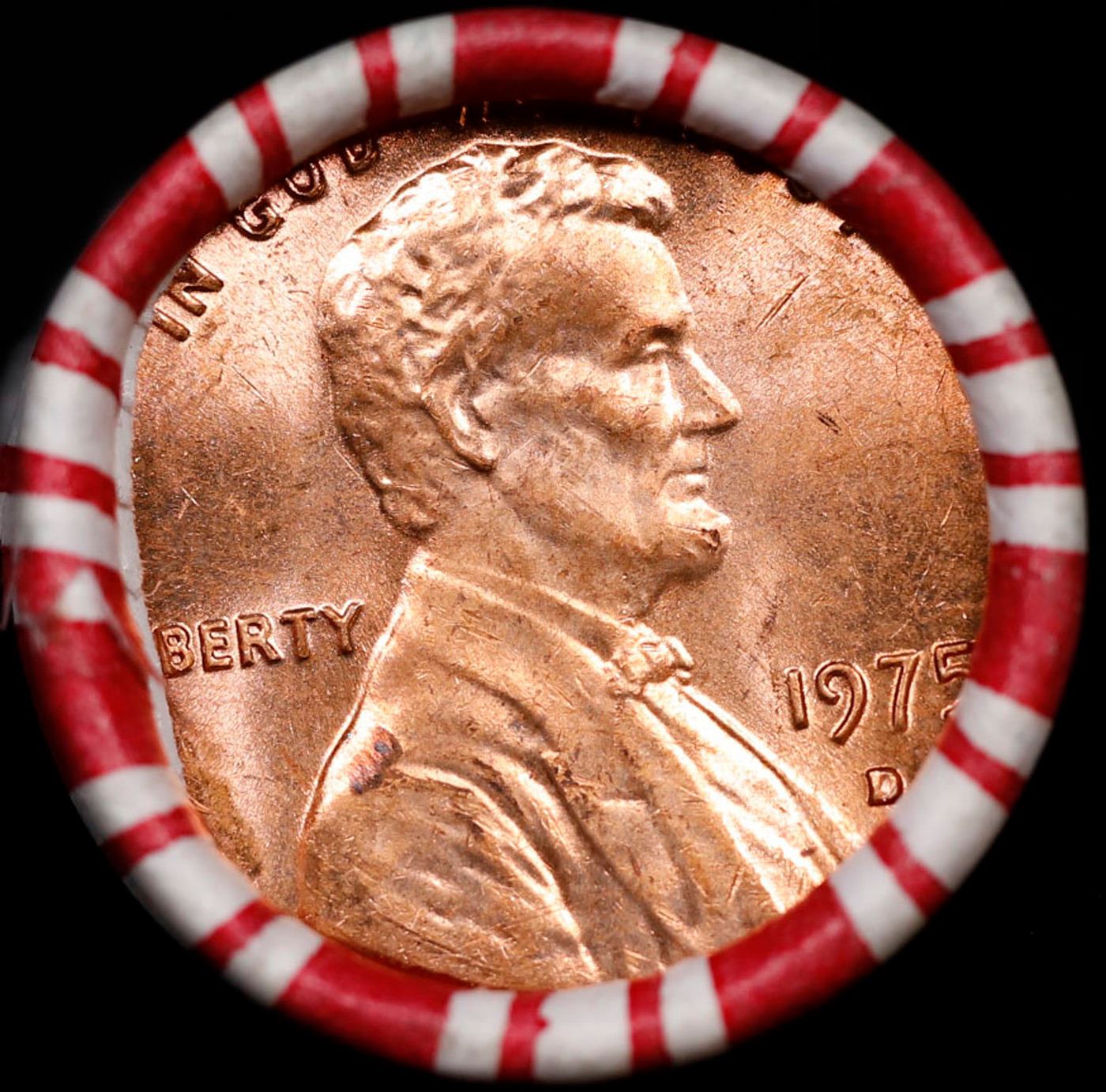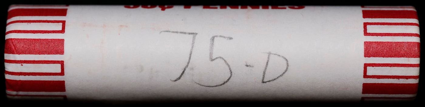 Shotgun Lincoln 1c roll, 1975-d 50 pcs Brandt 50c Wrapper.. A terrific Shotgun roll of Lincoln cents. Most if not all coin should be cherry red.