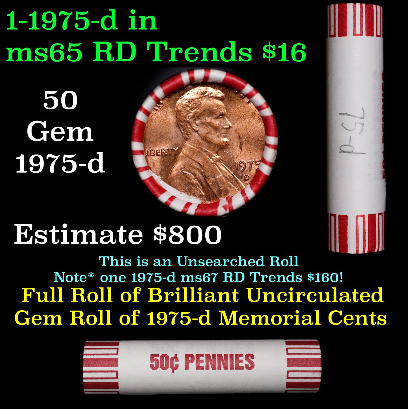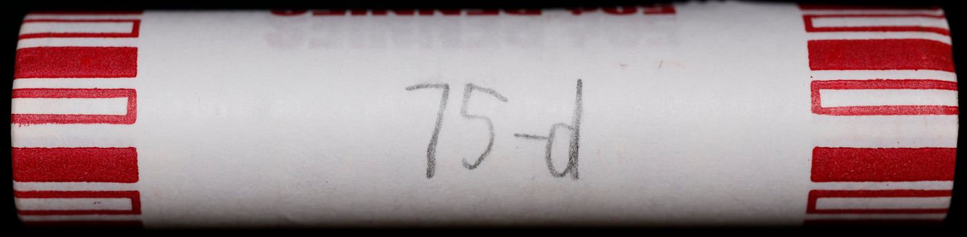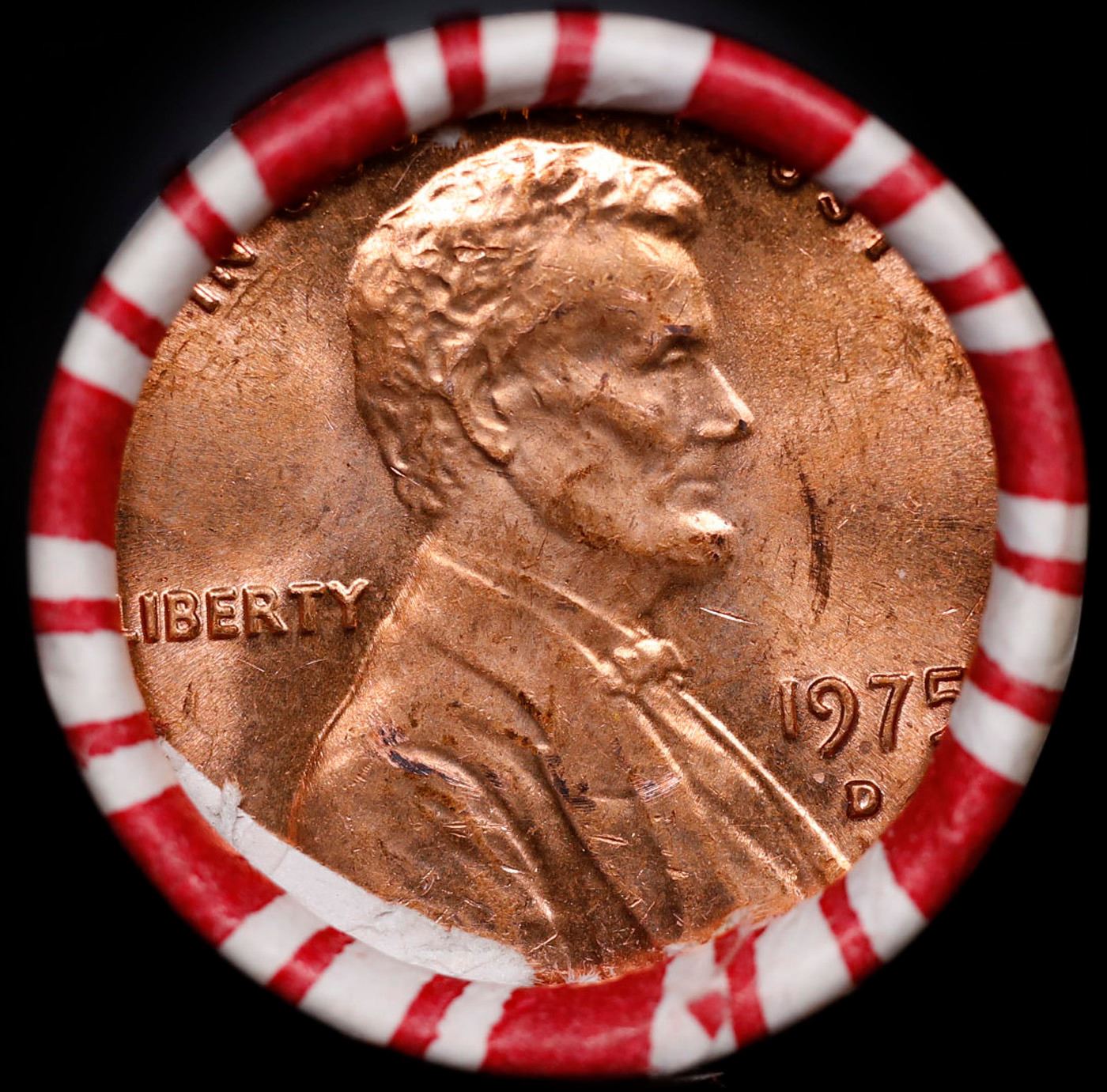 Shotgun Lincoln 1c roll, 1975-d 50 pcs Original Bank Wrapper.. A terrific Shotgun roll of Lincoln cents. Most if not all coin should be cherry red.