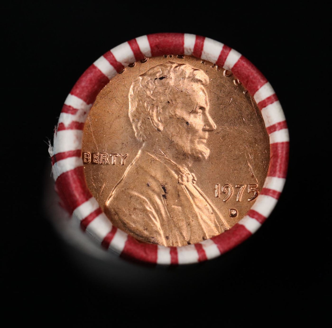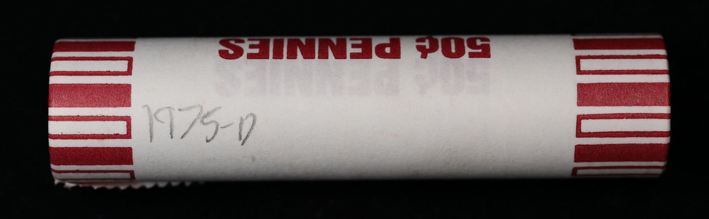 Shotgun Lincoln 1c roll, 1975-d 50 pcs Steel-Strong Wrapper.. A terrific Shotgun roll of Lincoln cents. Most if not all coin should be cherry red.