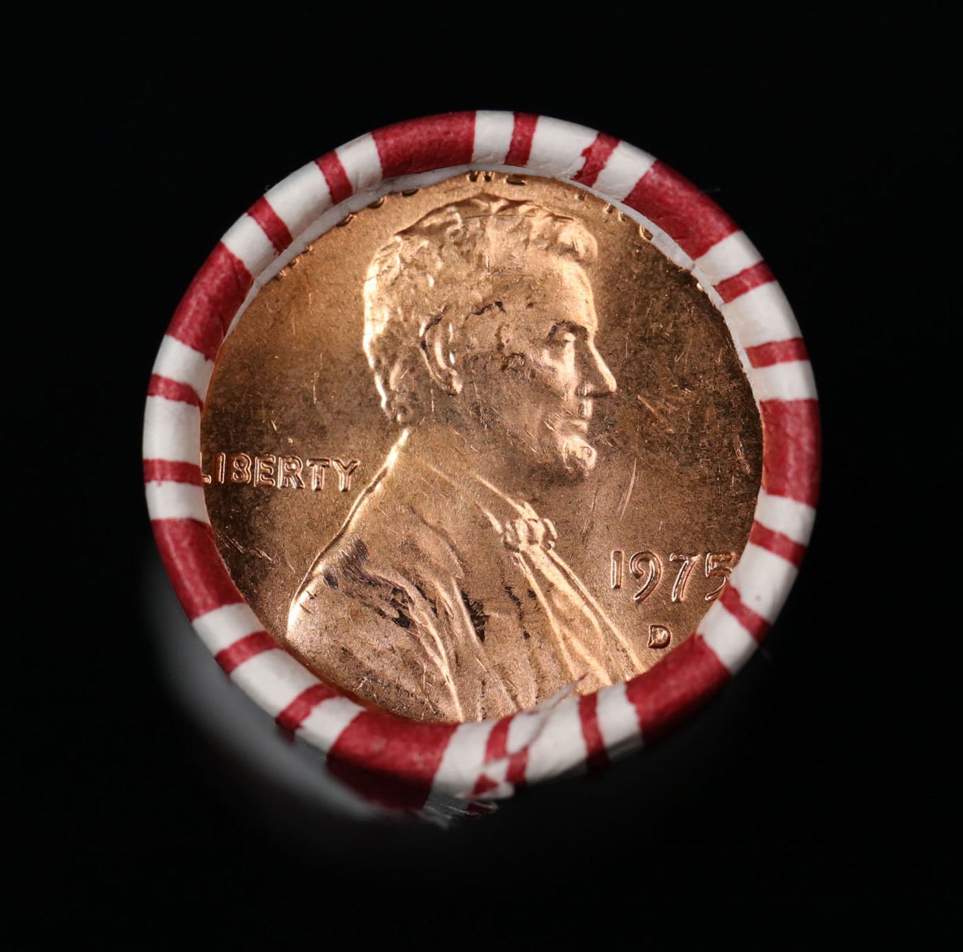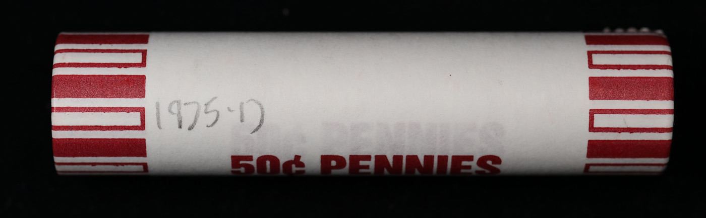 Shotgun Lincoln 1c roll, 1975-d 50 pcs Steel-Strong Wrapper.. A terrific Shotgun roll of Lincoln cents. Most if not all coin should be cherry red.