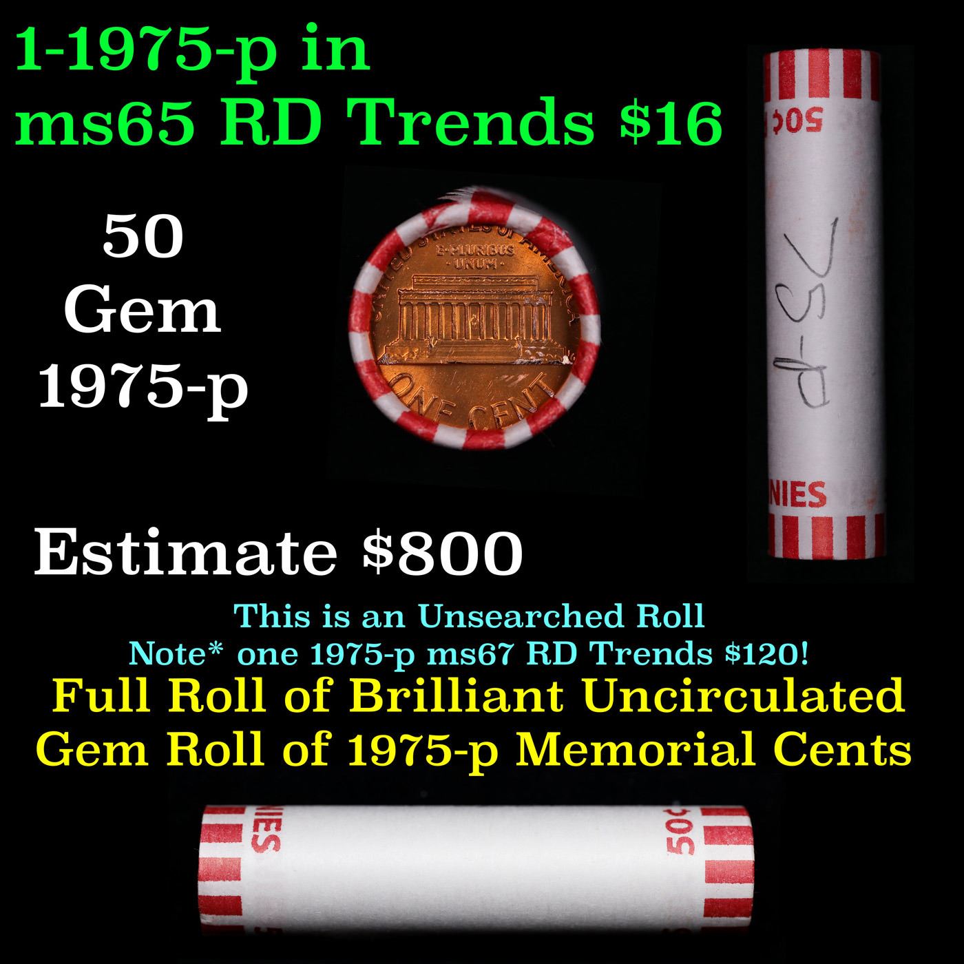 Shotgun Lincoln 1c roll, 1975-p 50 pcs Bank Wrapper.. A terrific Shotgun roll of Lincoln cents. Most if not all coin should be cherry red.