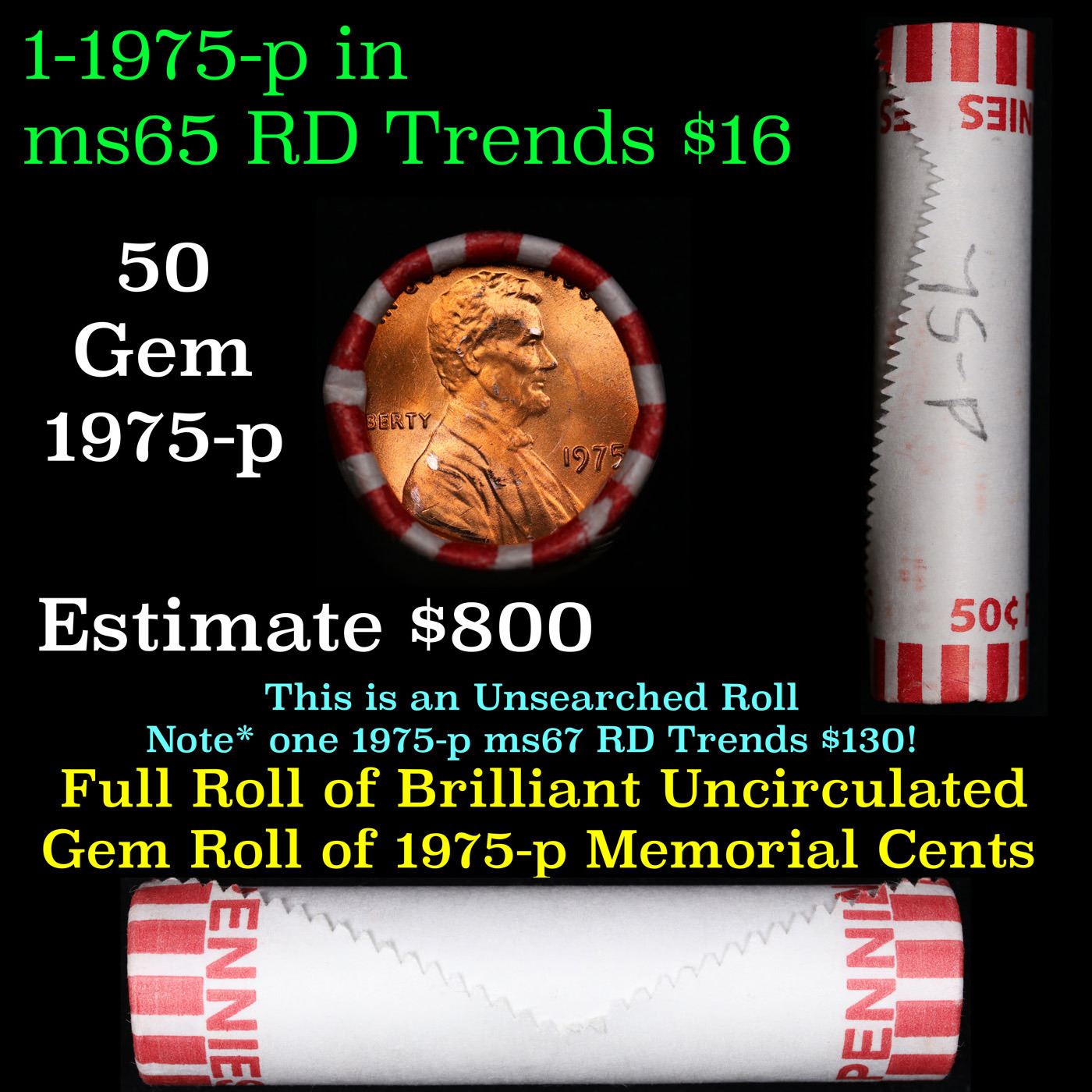 Shotgun Lincoln 1c roll, 1975-p 50 pcs Bank Wrapper.. A terrific Shotgun roll of Lincoln cents. Most if not all coin should be cherry red.