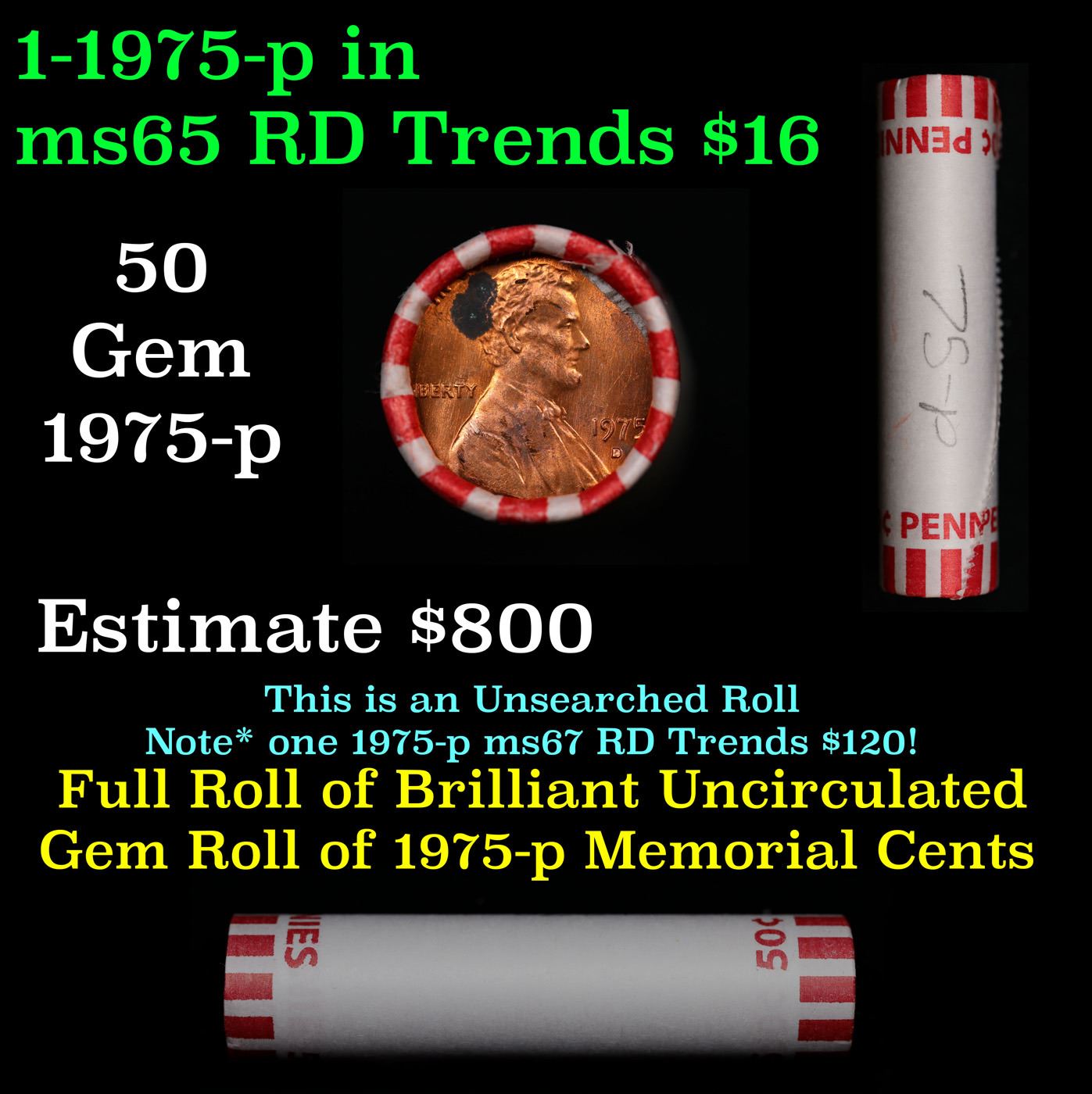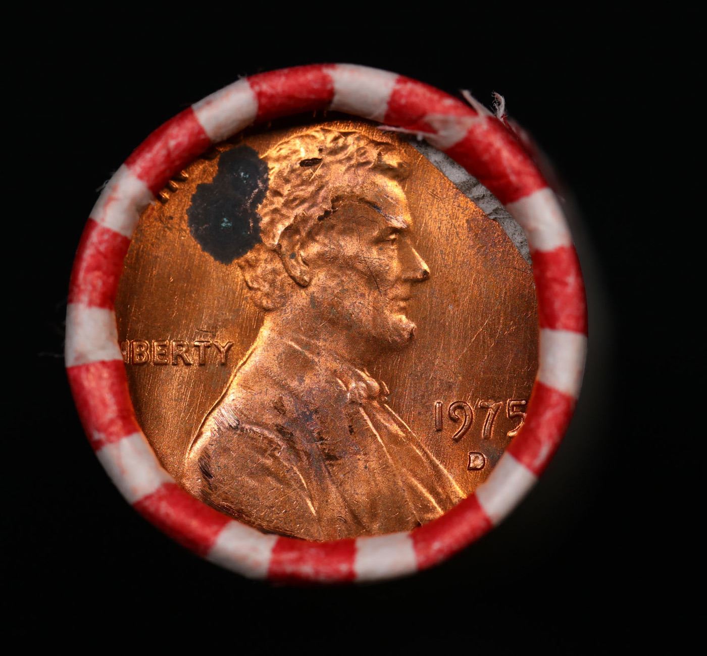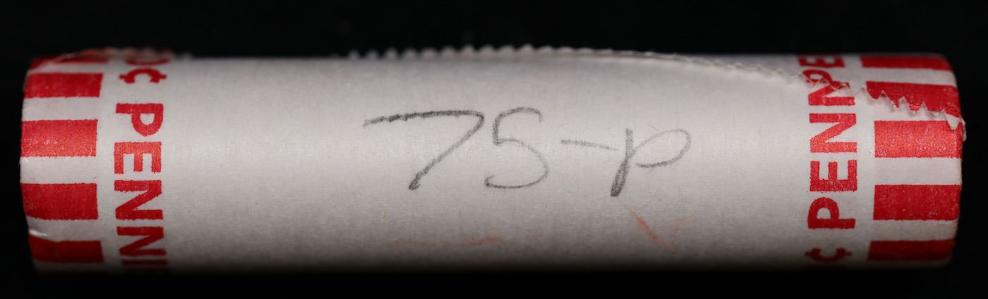 Shotgun Lincoln 1c roll, 1975-p 50 pcs Bank Wrapper.. A terrific Shotgun roll of Lincoln cents. Most if not all coin should be cherry red.
