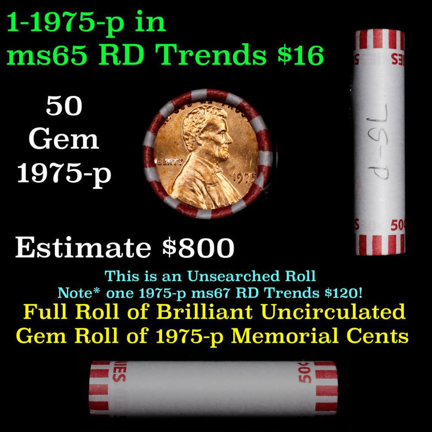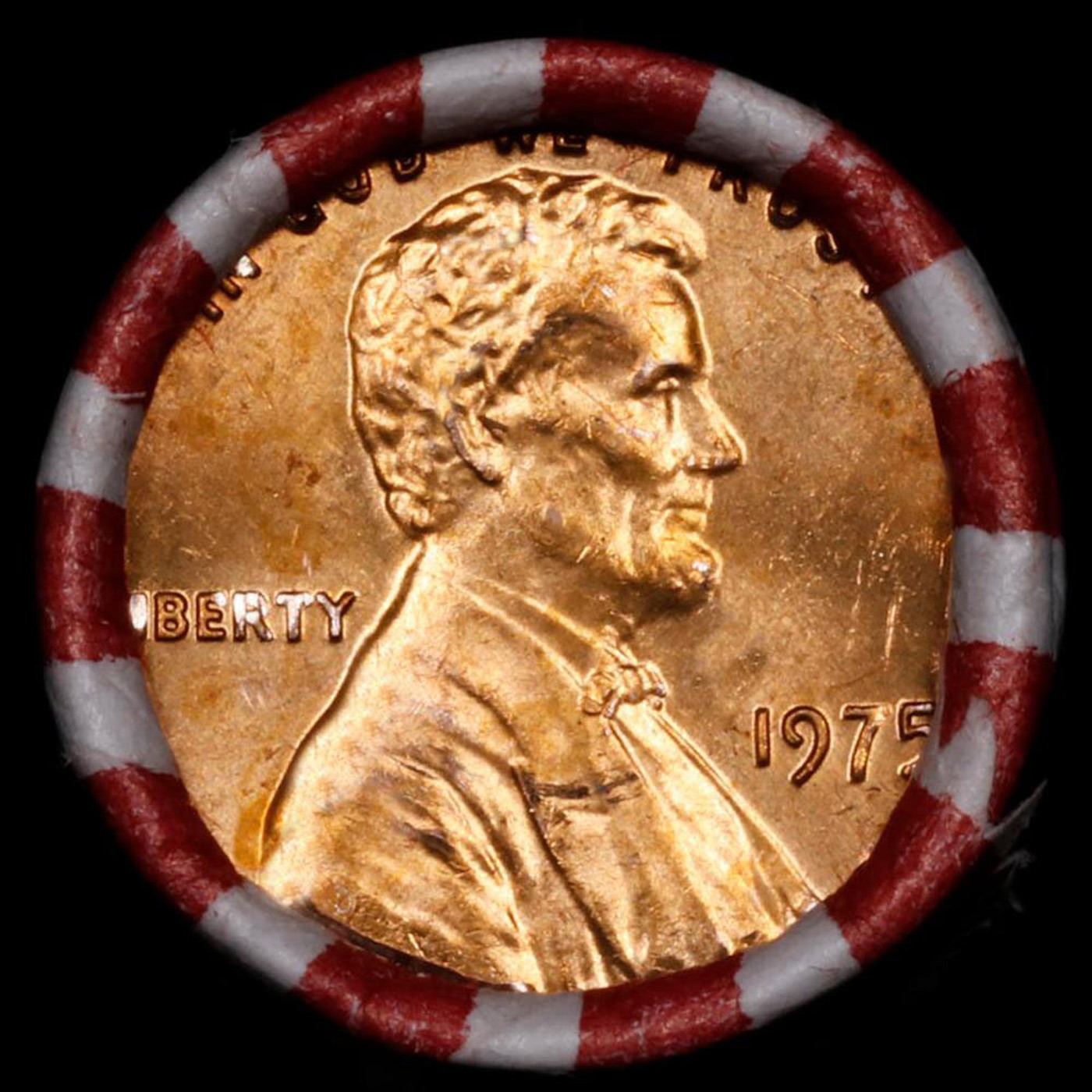 Shotgun Lincoln 1c roll, 1975-p 50 pcs Bank Wrapper.. A terrific Shotgun roll of Lincoln cents. Most if not all coin should be cherry red.