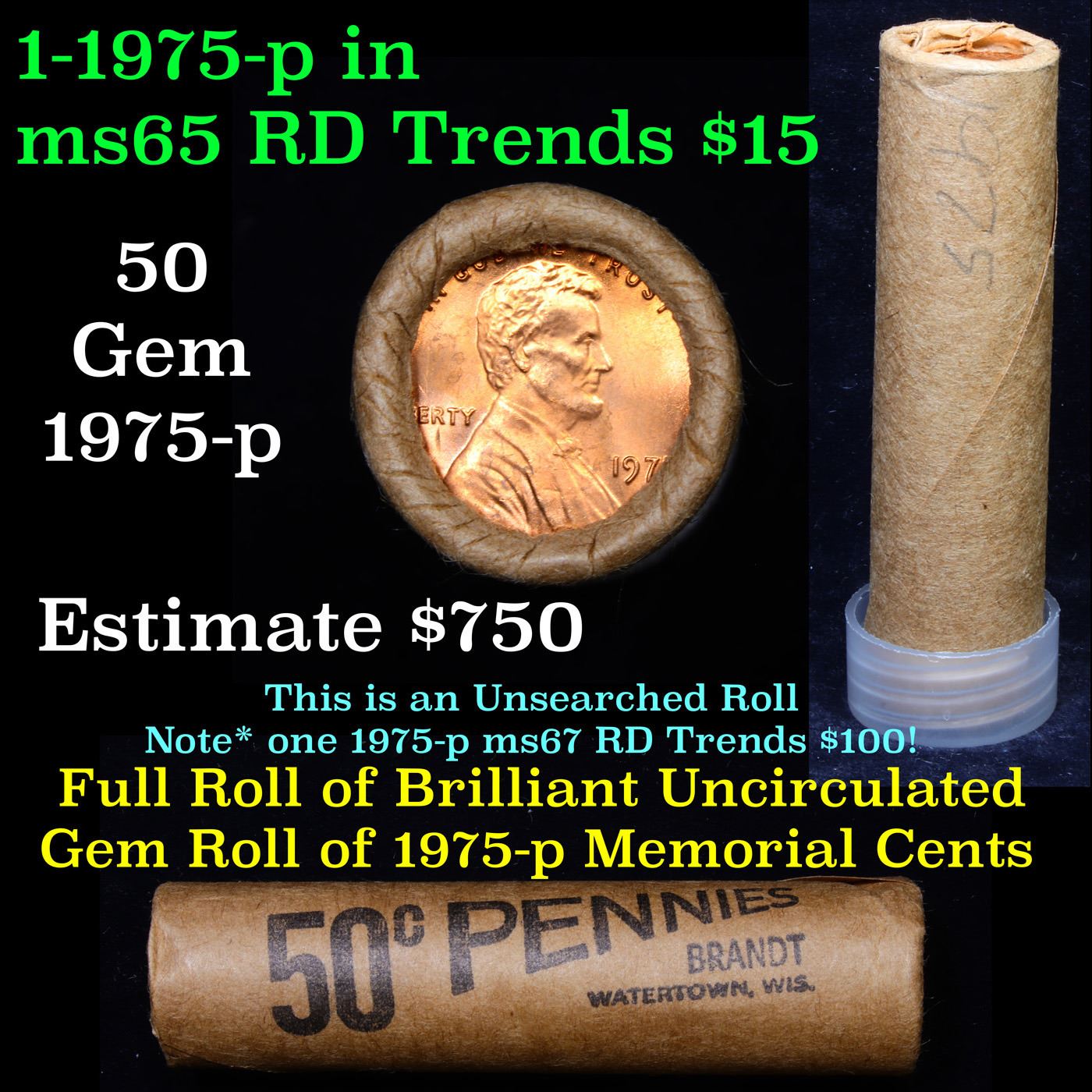 Shotgun Lincoln 1c roll, 1975-p 50 pcs Brandt Wrapper. A terrific Shotgun roll of Lincoln cents. All coins cherry red. Trends ms65 rd $15 Estimate $750