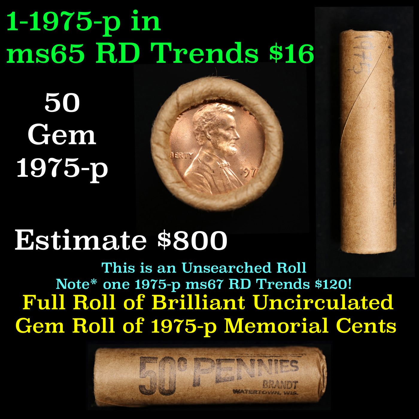 Shotgun Lincoln 1c roll, 1975-p 50 pcs Brandt Wrapper.. A terrific Shotgun roll of Lincoln cents. Most if not all coin should be cherry red. Trends ms65 rd $16