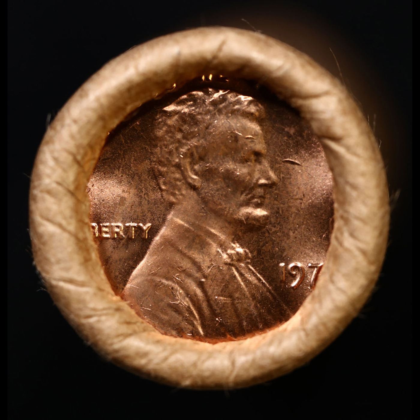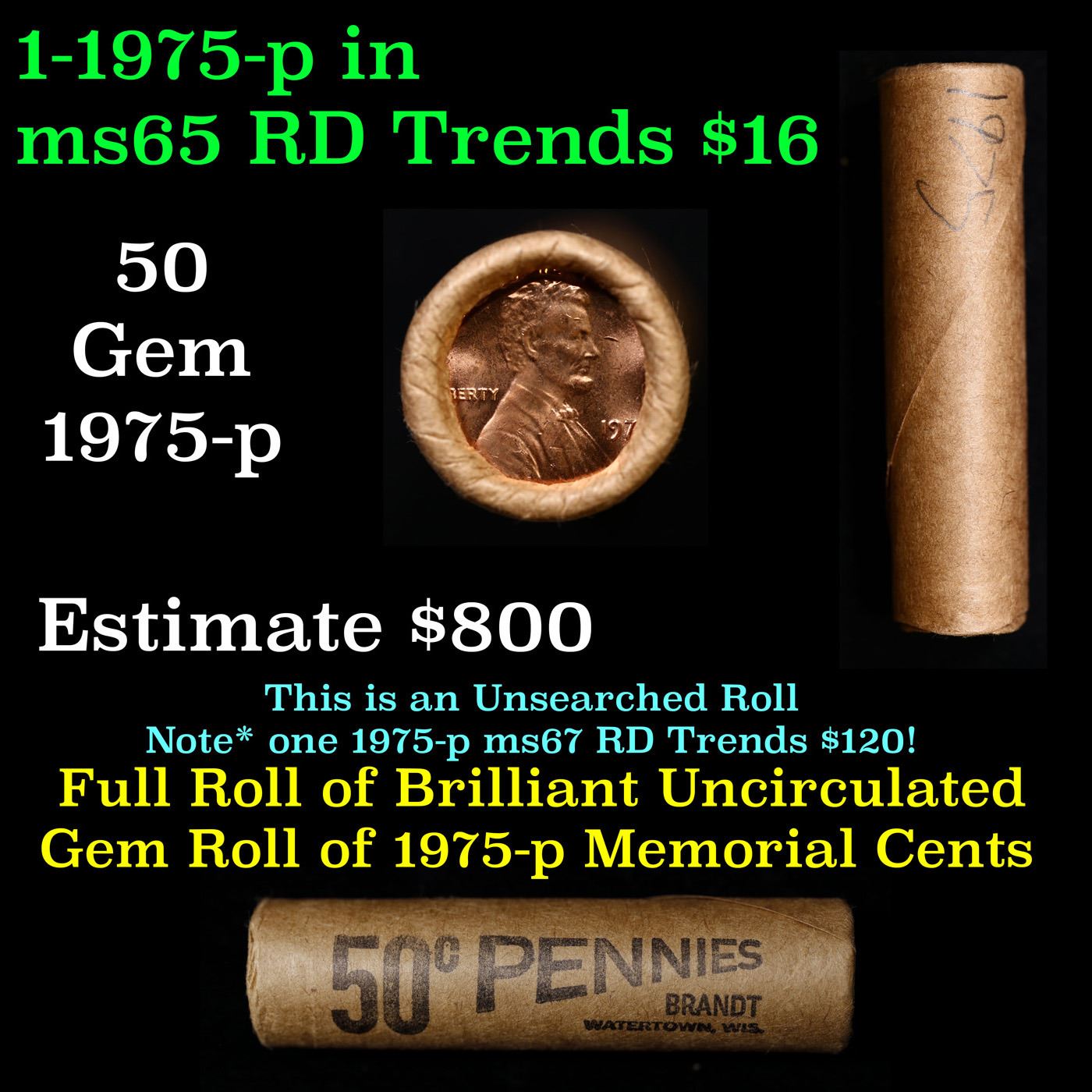 Shotgun Lincoln 1c roll, 1975-p 50 pcs Brandt Wrapper.. A terrific Shotgun roll of Lincoln cents. Most if not all coin should be cherry red.
