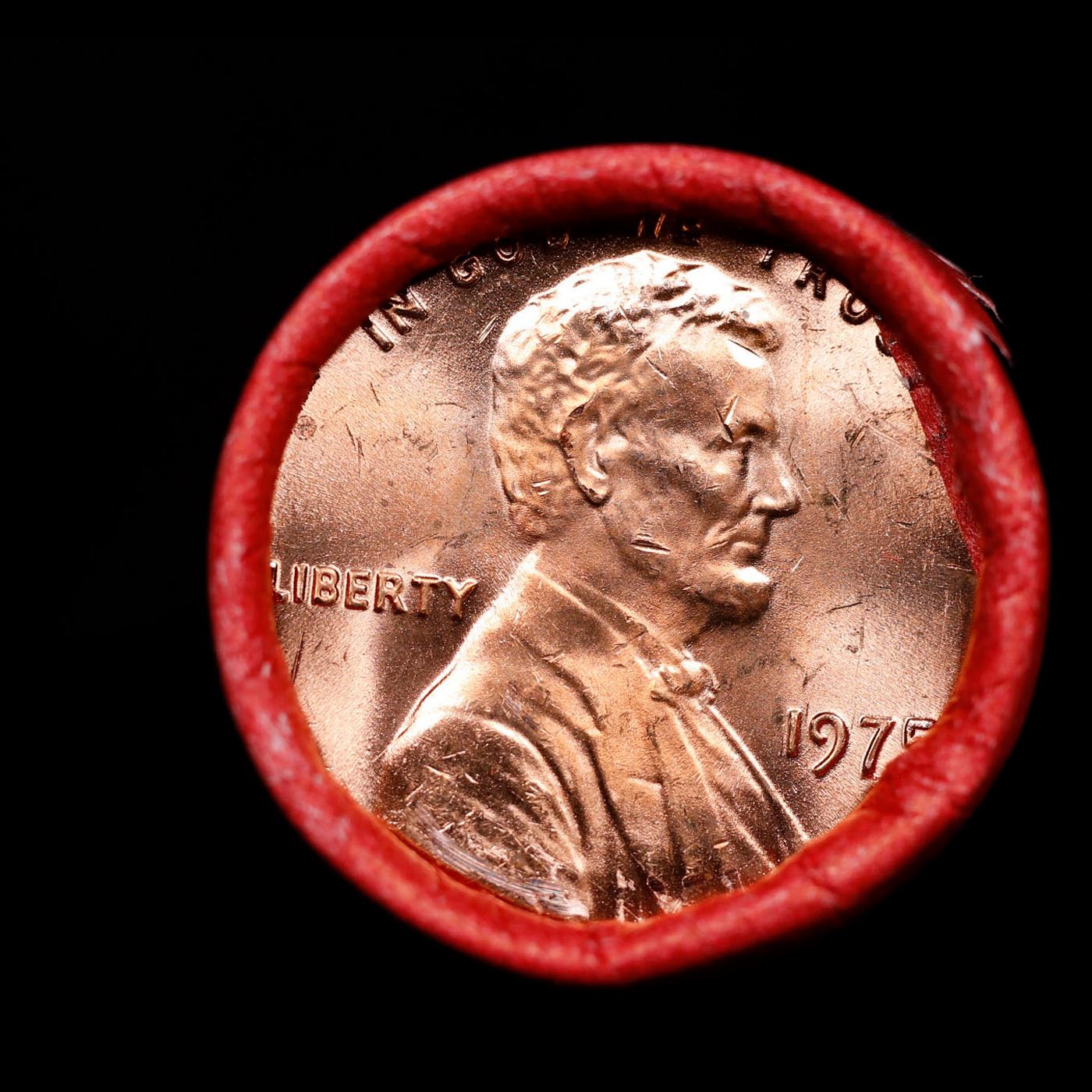 Shotgun Lincoln 1c roll, 1975-p 50 pcs Steel-Strong Wrapper.. A terrific Shotgun roll of Lincoln cents. Most if not all coin should be cherry red.