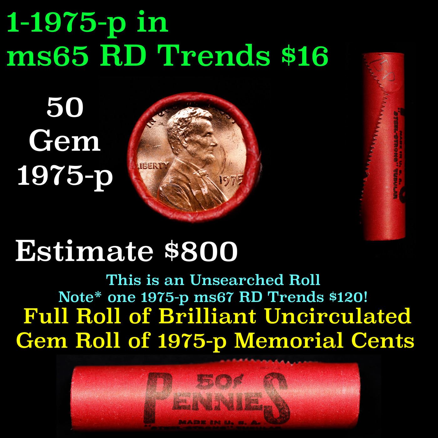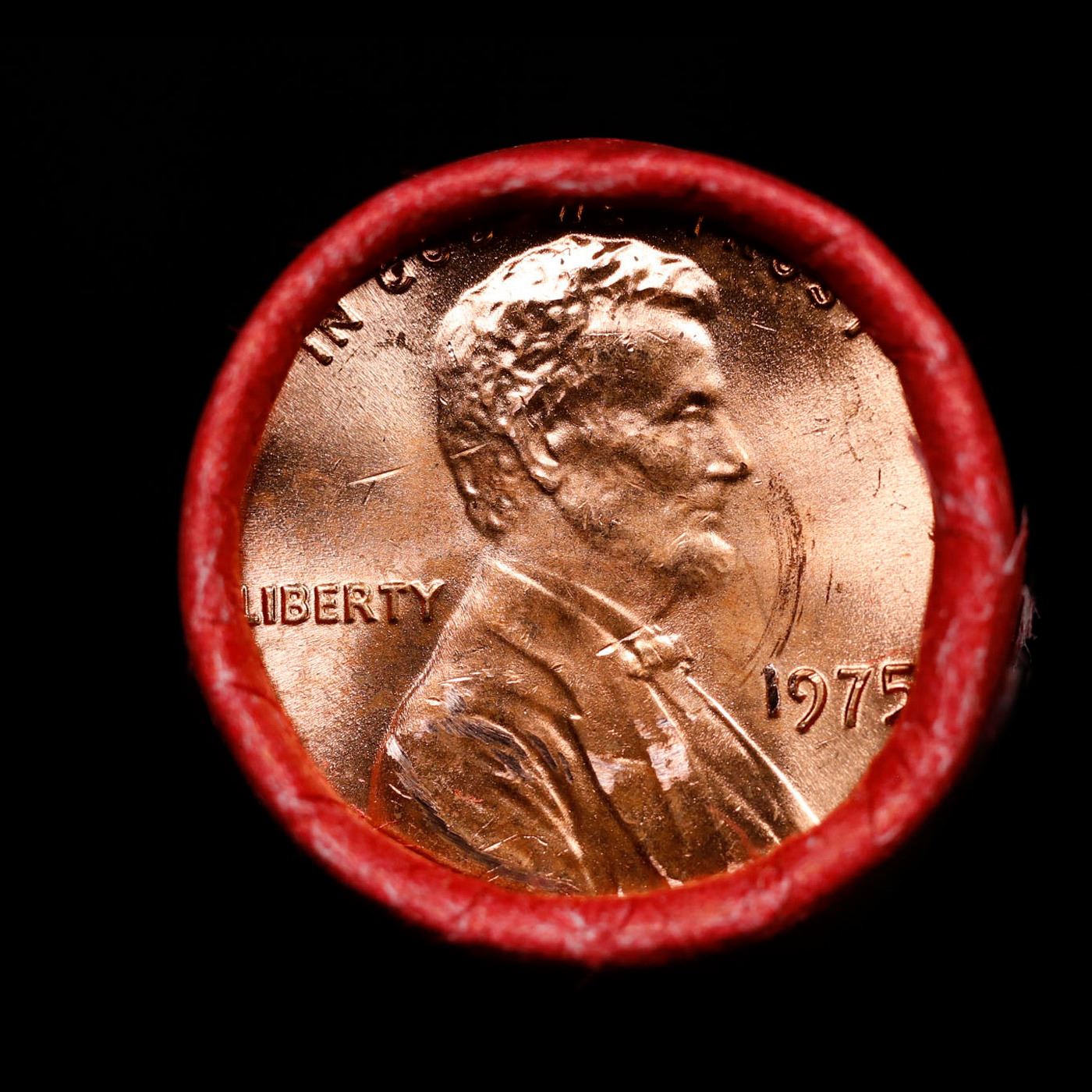 Shotgun Lincoln 1c roll, 1975-p 50 pcs Steel-Strong Wrapper.. A terrific Shotgun roll of Lincoln cents. Most if not all coin should be cherry red.