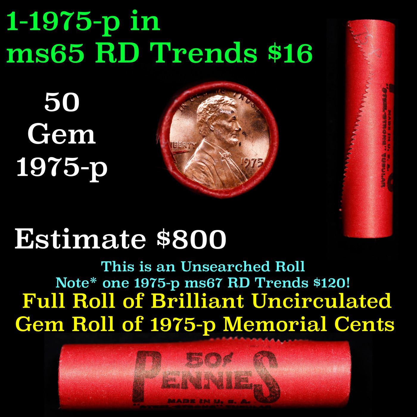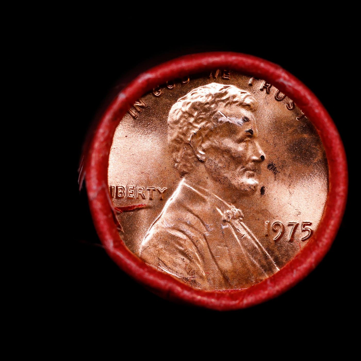 Shotgun Lincoln 1c roll, 1975-p 50 pcs Steel-Strong Wrapper.. A terrific Shotgun roll of Lincoln cents. Most if not all coin should be cherry red.