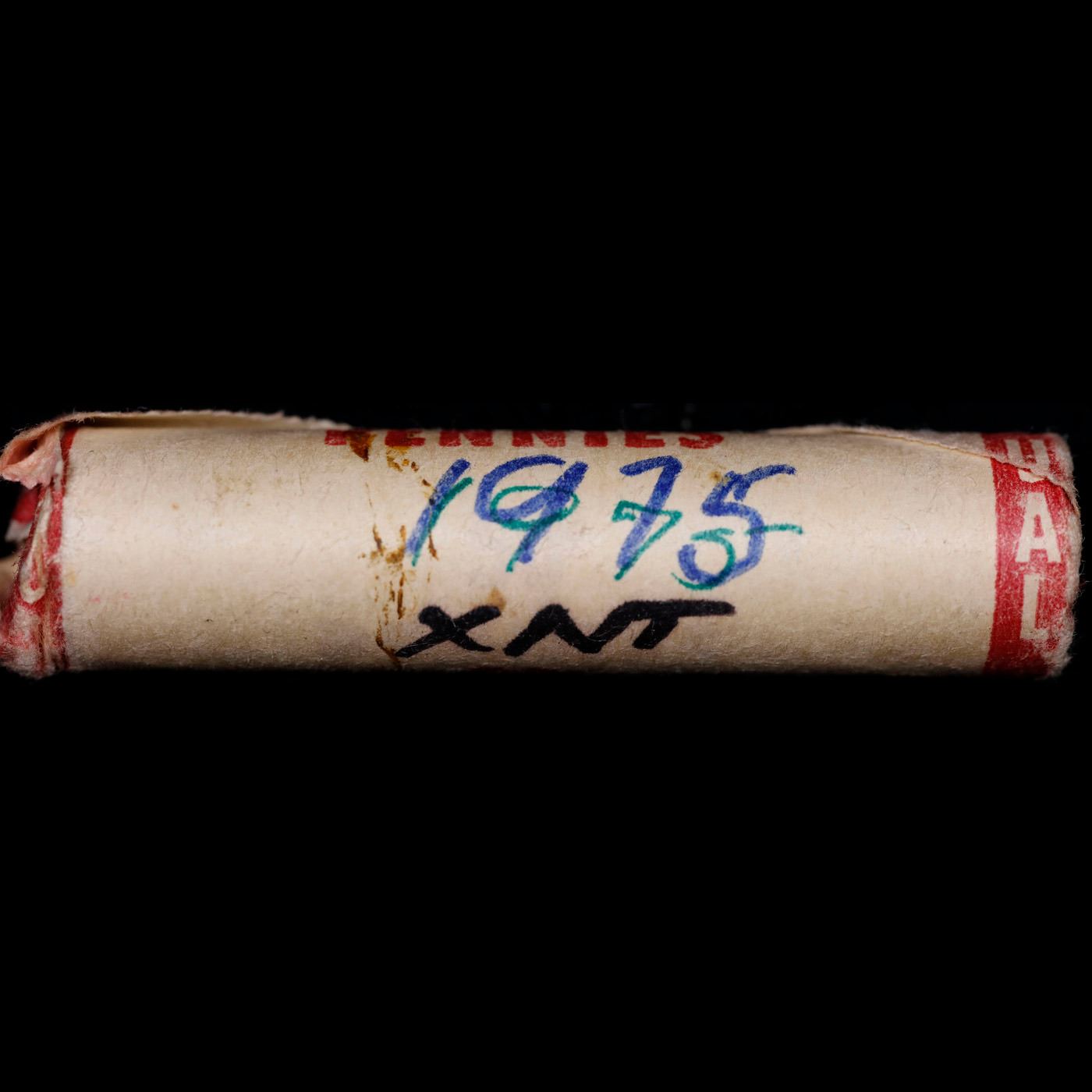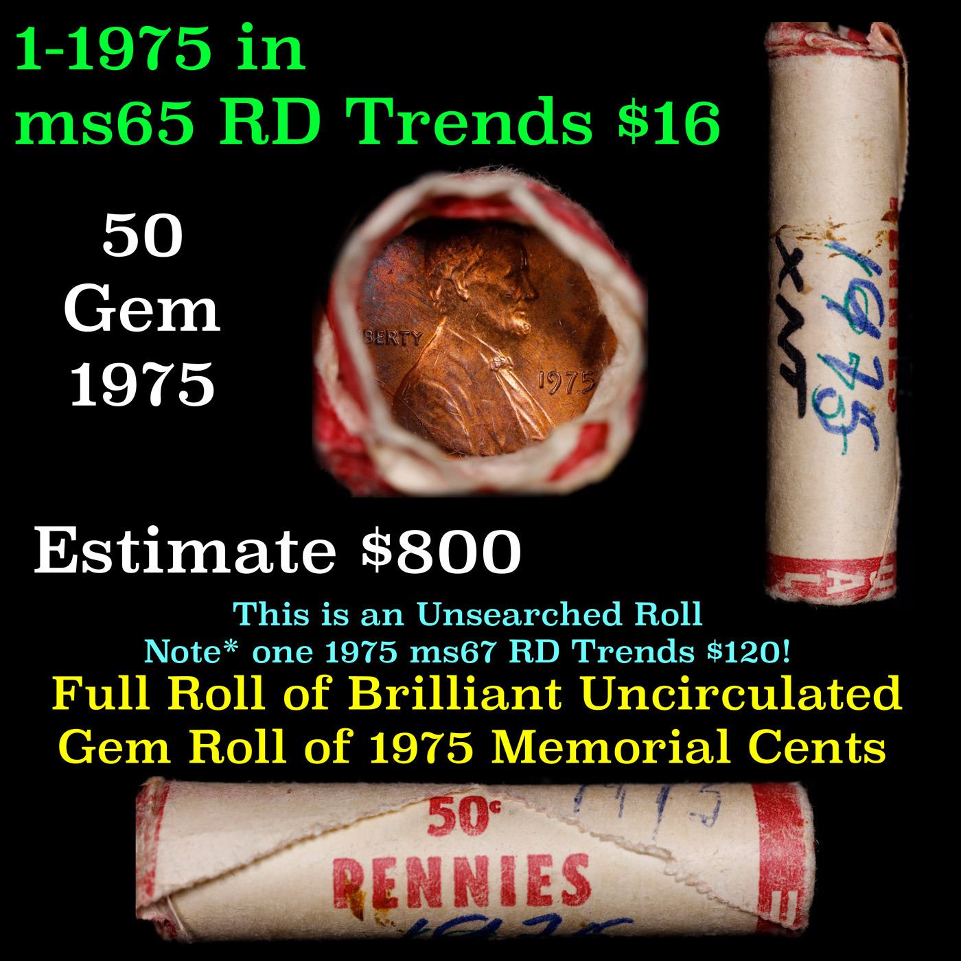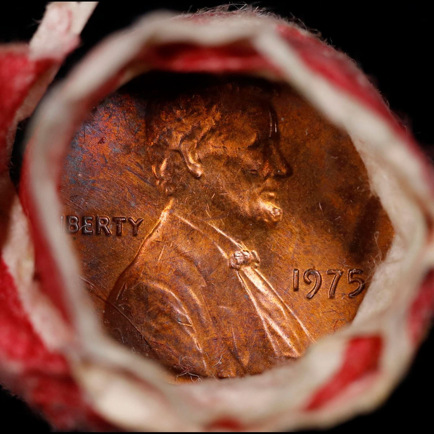 Shotgun Lincoln 1c roll, 1975-p 50 pcs Wrapper . A terrific Shotgun roll of Lincoln cents. All coins appear to be cherry red. Trends ms65 rd $16