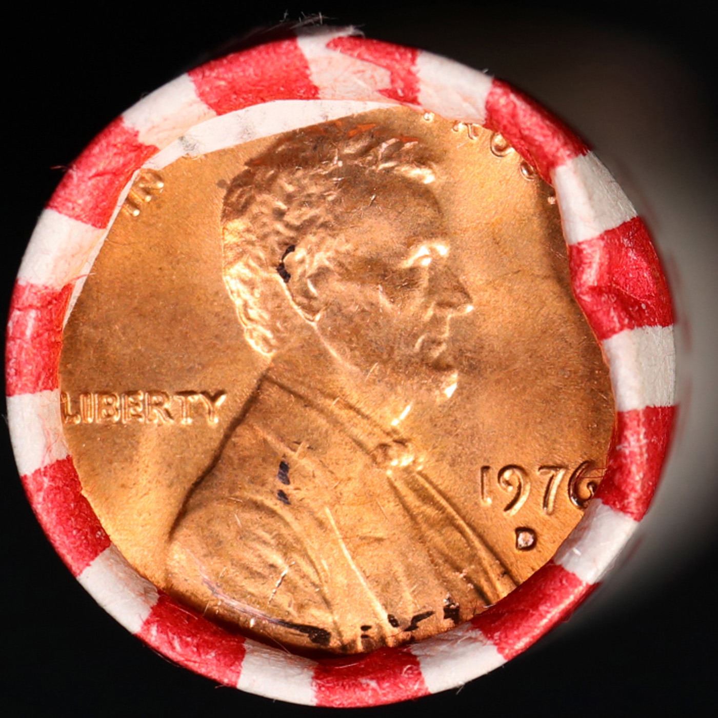Shotgun Lincoln 1c roll, 1976-d 50 pcs Bank Wrapper.. A terrific Shotgun roll of Lincoln cents. Most if not all coin should be cherry red.