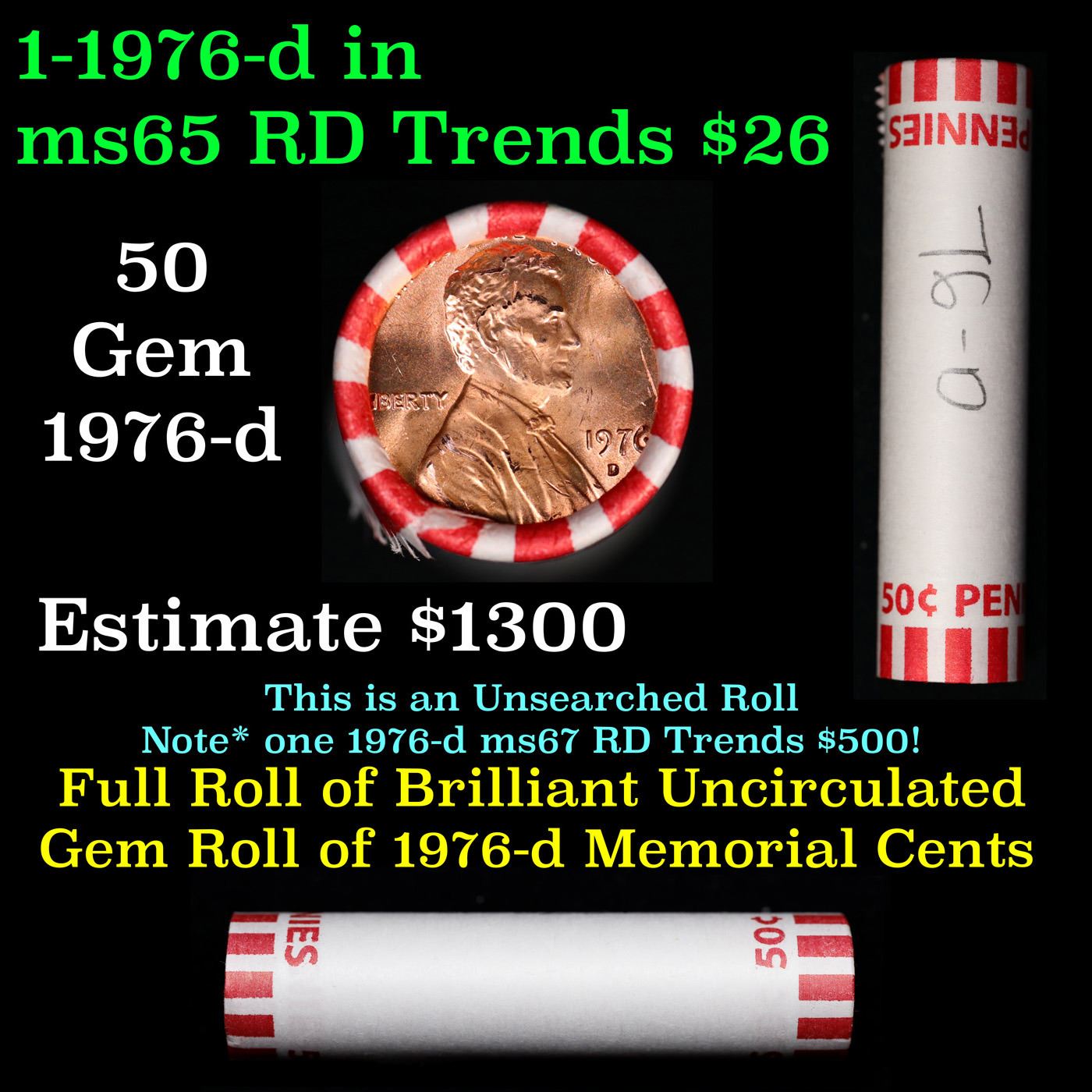 Shotgun Lincoln 1c roll, 1976-d 50 pcs Bank Wrapper.. A terrific Shotgun roll of Lincoln cents. Most if not all coin should be cherry red.
