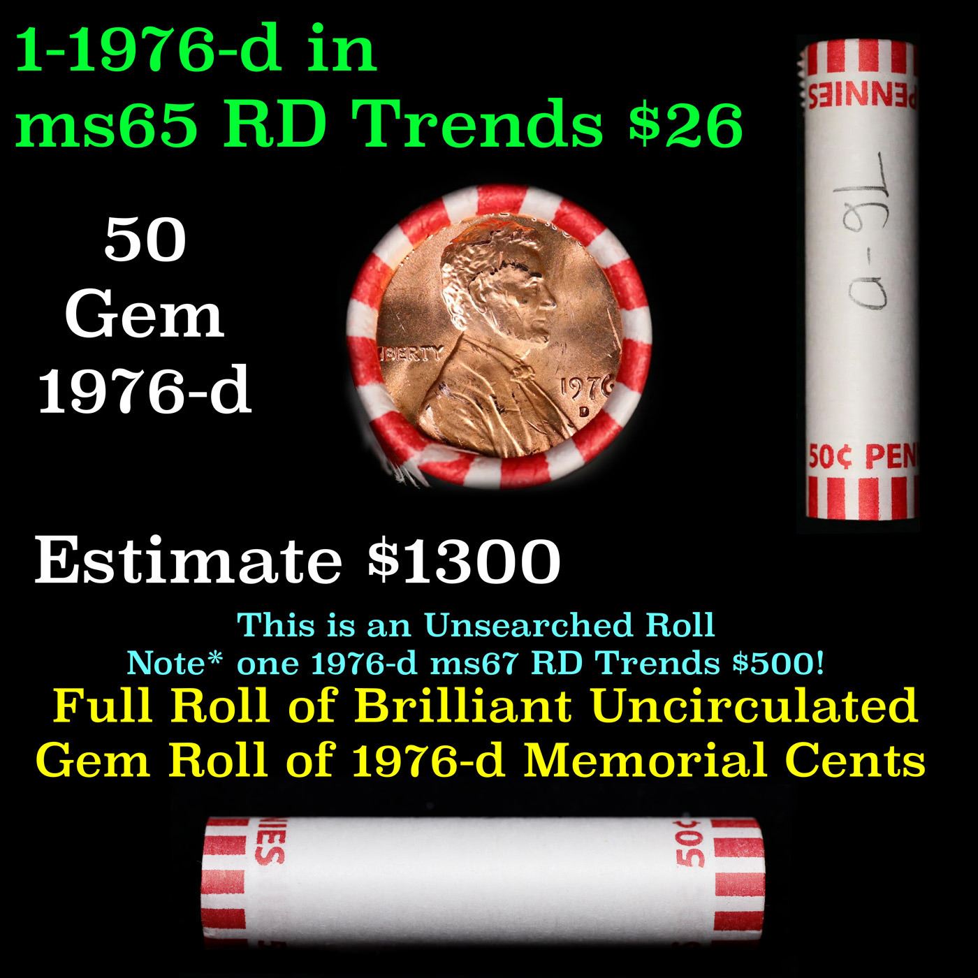 Shotgun Lincoln 1c roll, 1976-d 50 pcs Bank Wrapper.. A terrific Shotgun roll of Lincoln cents. Most if not all coin should be cherry red.